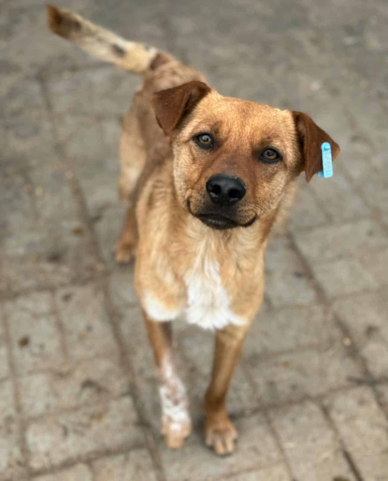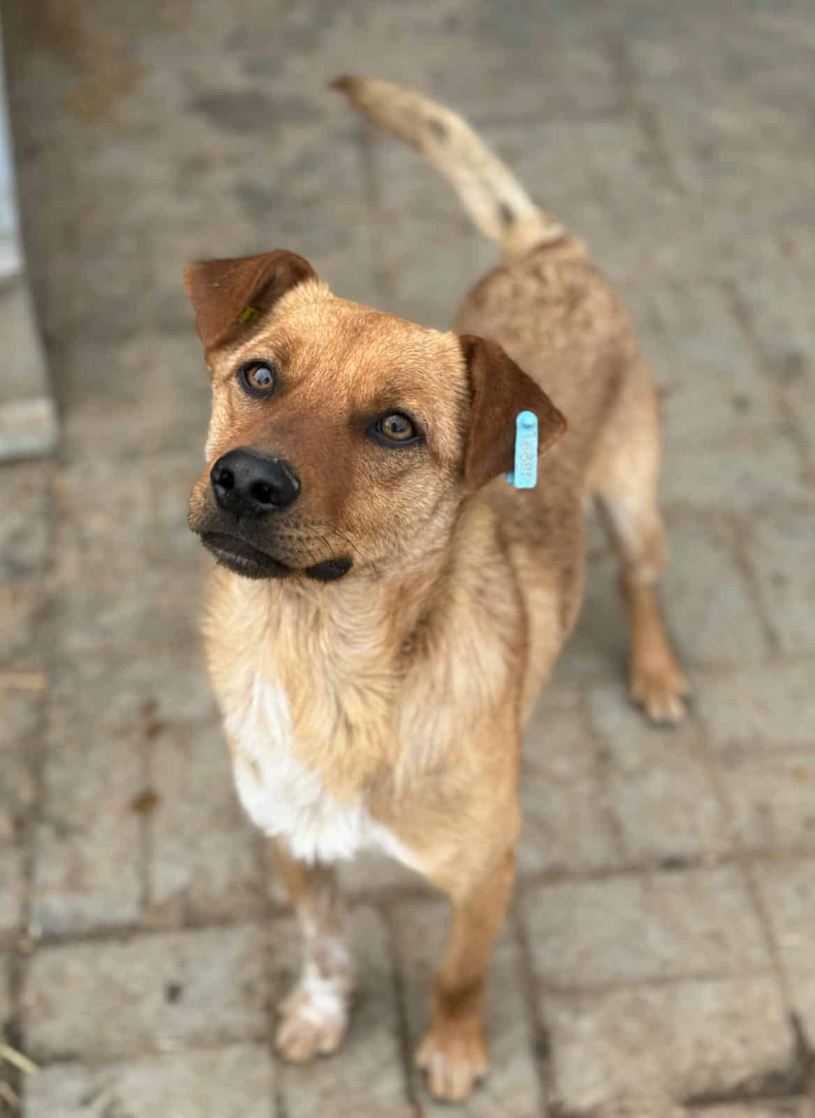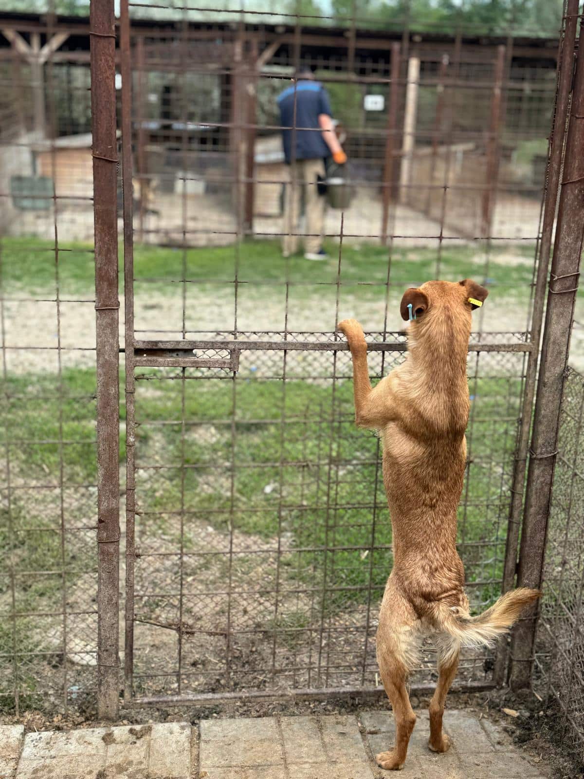 SAROO hat sich positiv entwickelt. Zunächst lag er unscheinbar in seiner Hütte, während wir uns mit anderen Hunden beschäftigten. Was ihn aus der Hütte lockte, war der Arbeiter des Shelters, der die Hunde täglich versorgt. SAROO stand freudig am Kennelgitter und zeigte sich ab da auch uns gegenüber aufgeschlossener. Wir konnten ihn streicheln, was für ihn noch etwas ungewohnt war. In einer ruhigeren Umgebung wird er sicherlich schnell auftauen.