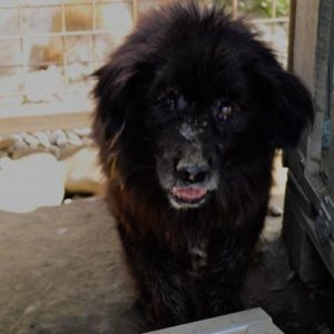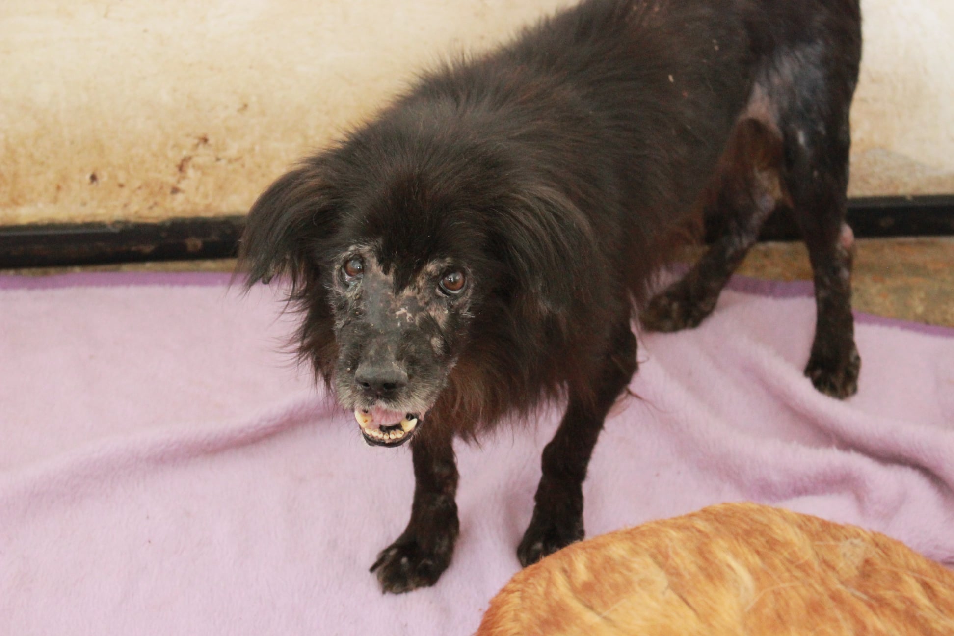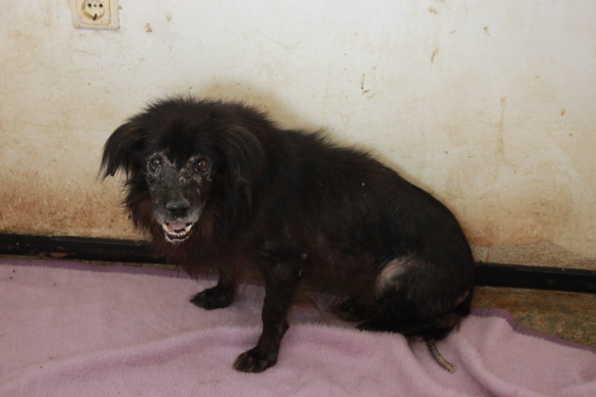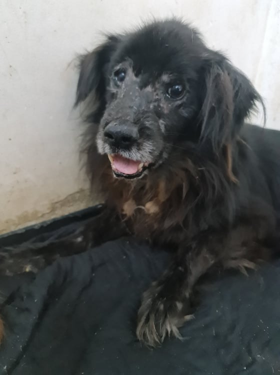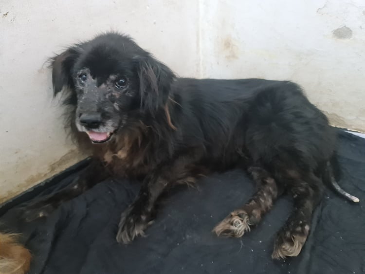 Der Senior lässt sich vorsichtig anfassen. Er lebt aktuell mit anderen älteren Hunden zusammen.