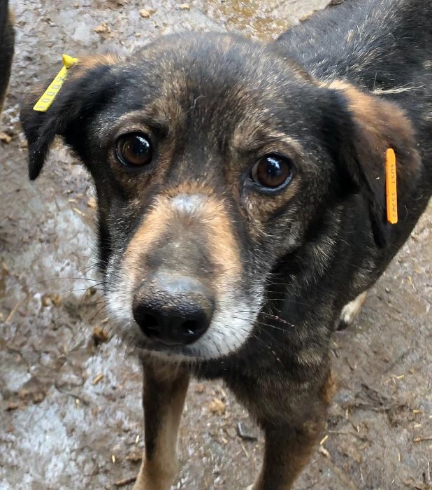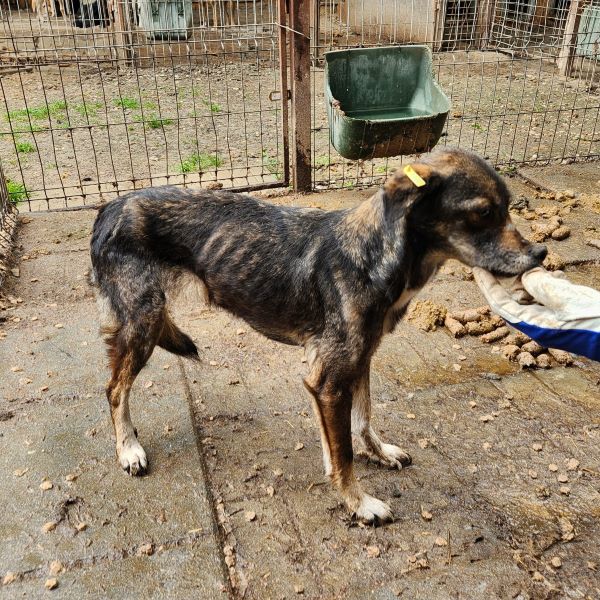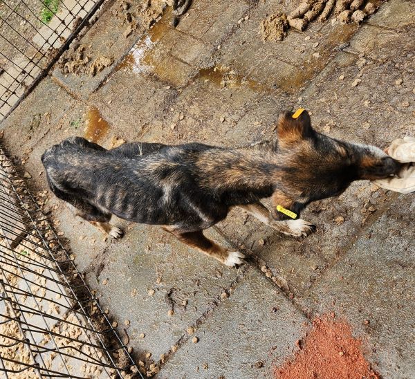 Beim Blick hinter die Hütte haben wir eine herzzerreißende Entdeckung gemacht als wir dieses klapperdürre, völlig abgemagerte Seelchen entdeckt haben. Wir haben die Hündin sofort mit dem lebensnotwendigen Futter und Wasser versorgt, über das sie sich gierig hergemacht hat. Bei der zarten Maus ist es sprichwörtlich 5 vor 12, sie hätte im Kennel nicht mehr lange überlebt. Die Tierärztin wurde umgehend über diesen Notfall informiert, es ist für uns klar, dass das sensible Mäuschen im harten Shelter-Alltag nicht überlebensfähig ist und daher dringend zeitnahe ein geborgenes Körbchen benötigt. Sie zeigte sich uns gegenüber am Näschen anfassbar und würde sich in einem sicheren Umfeld bestimmt rasch eingewöhnen.