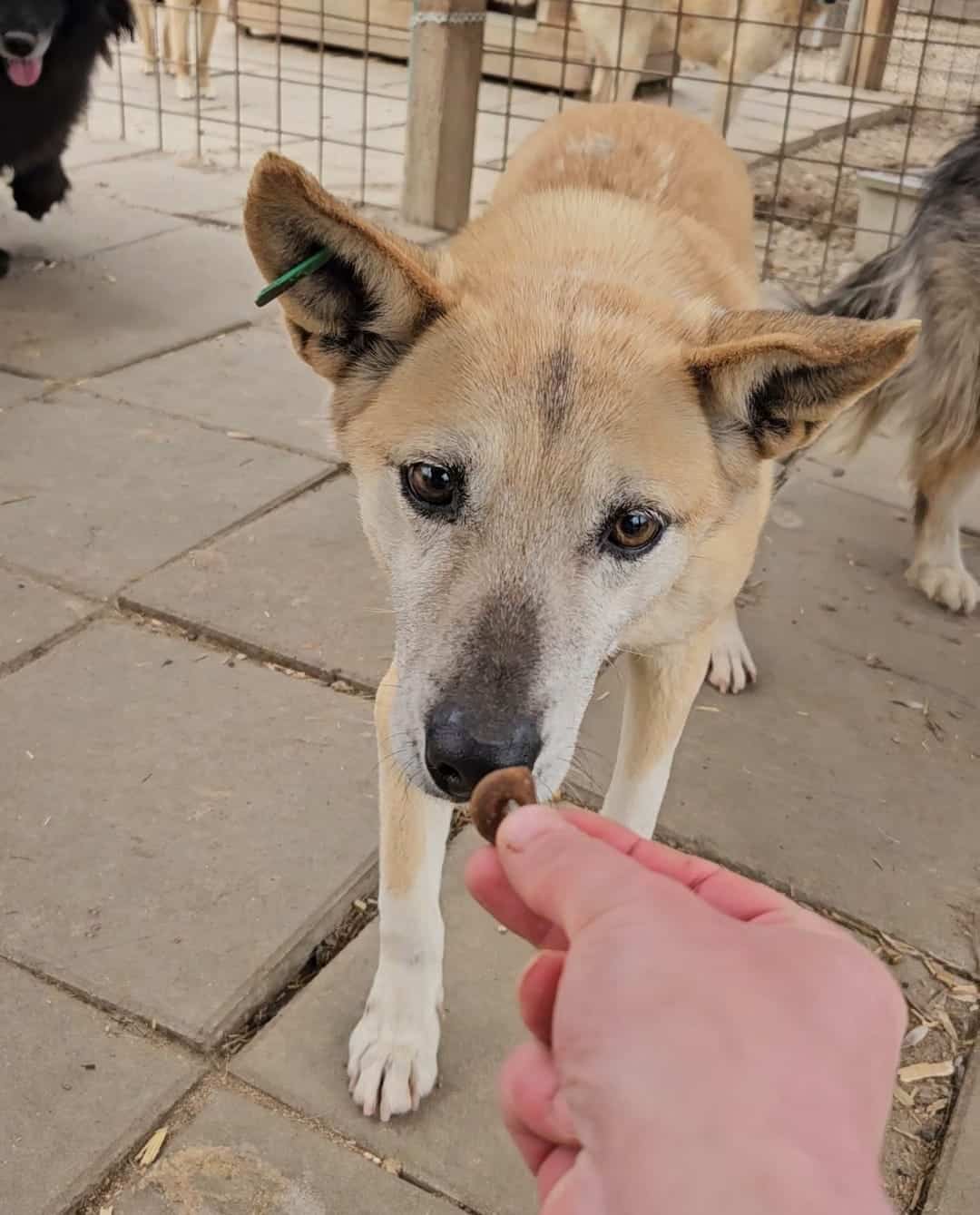 SAVANNAH nimmt vorsichtig Leckerlie aus der Hand, ist aber weiterhin unsicher. Sie braucht unbedingt souveräne Hunde um sich.