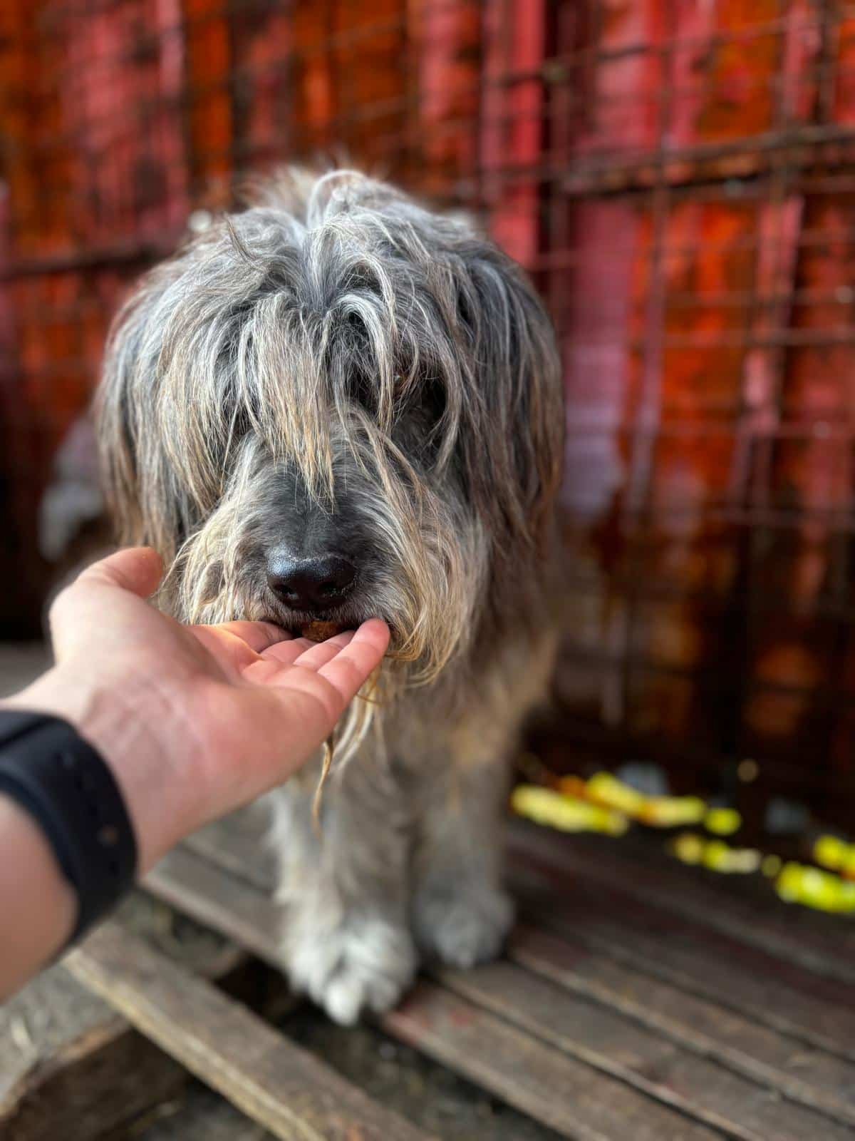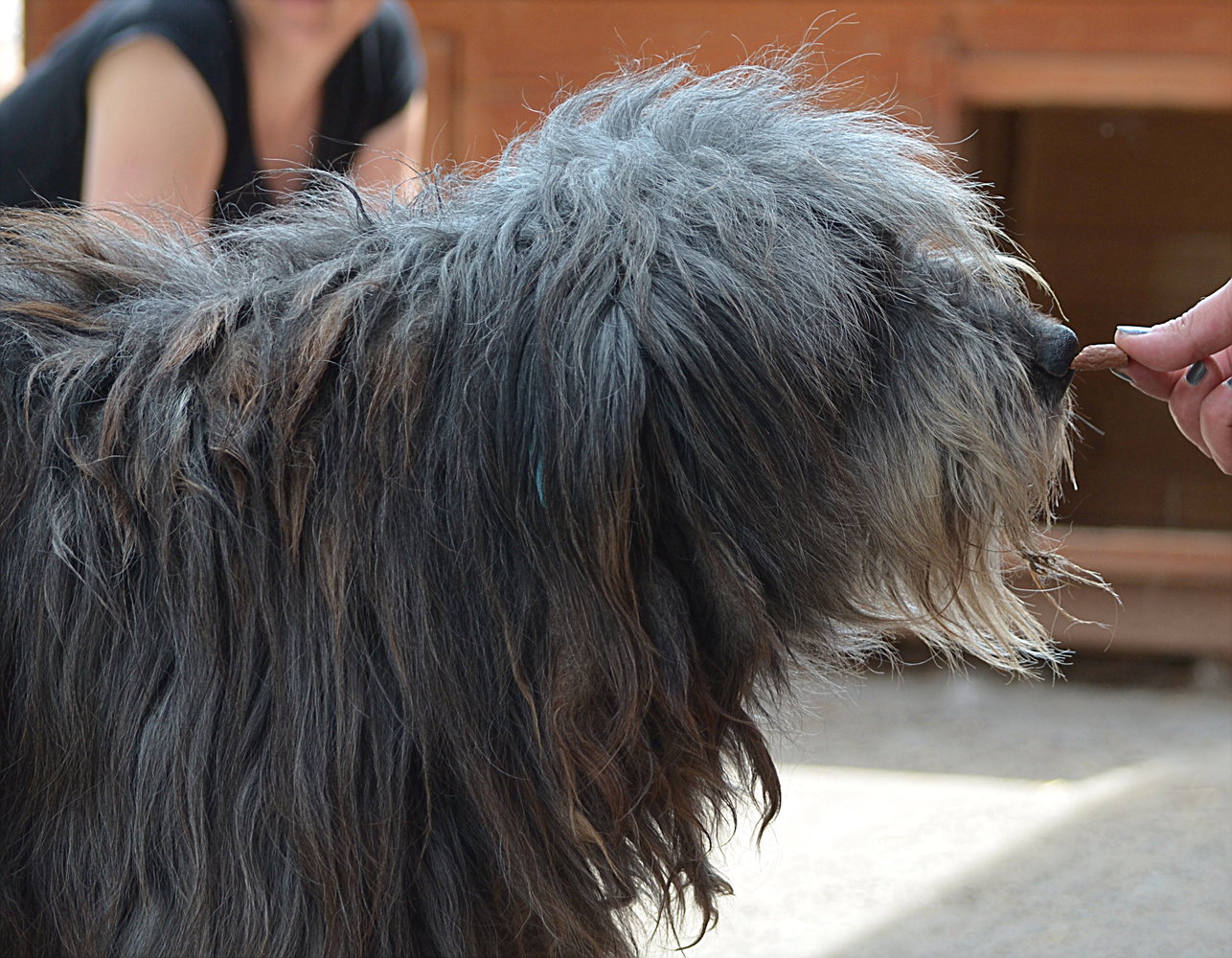 Scampolo ist ein zurückhaltender Rüde, der unsere Leckerlis auch gern aus der Hand nahm. Dabei konnten wir ihn schon vorsichtig berühren, allerdings wich er jedes Mal etwas zurück. Als wir ihn in einer Ecke bedrängten, konnten wir ihn gut anfassen.