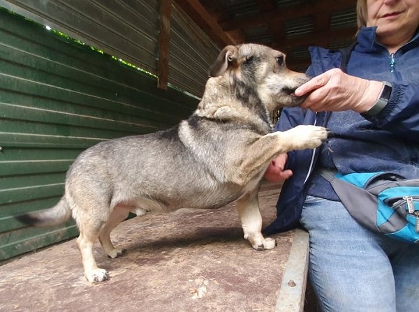 Wer auf der Suche nach einem super zutraulichen Wegbegleiter ist, der am liebsten den ganzen Tag im Rampenlicht stehen will und jede Aufmerksamkeit genießt, der ist beim ihm genau richtig. Mit seinen „Charlie-Chaplin-Beinchen“ kommt der kleine Wonneproppen daher und begrüßt auch Fremde gerne in seinem Zwinger. Trotz seiner gerade mal knapp 35cm Körpergröße klettert er im Nu auf die Hütten im Zwinger, damit er in der ersten Reihe für die mitgebrachten Leckerlies steht, und drängelt sich so auch gerne vorwitzig vor. Da die kleine Schmusebacke wirklich alles für Leckerchen zu tun scheint, ist er seinen Zwingerkollegen gegenüber etwas futterneidisch und wäre daher der perfekte Einzelprinz.