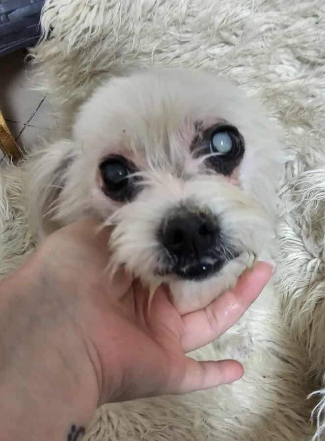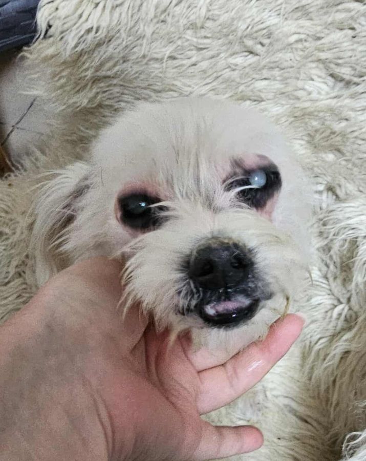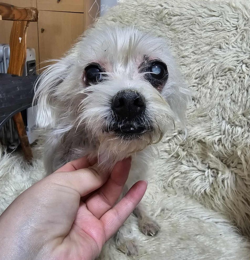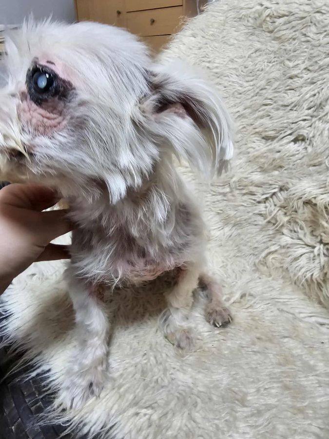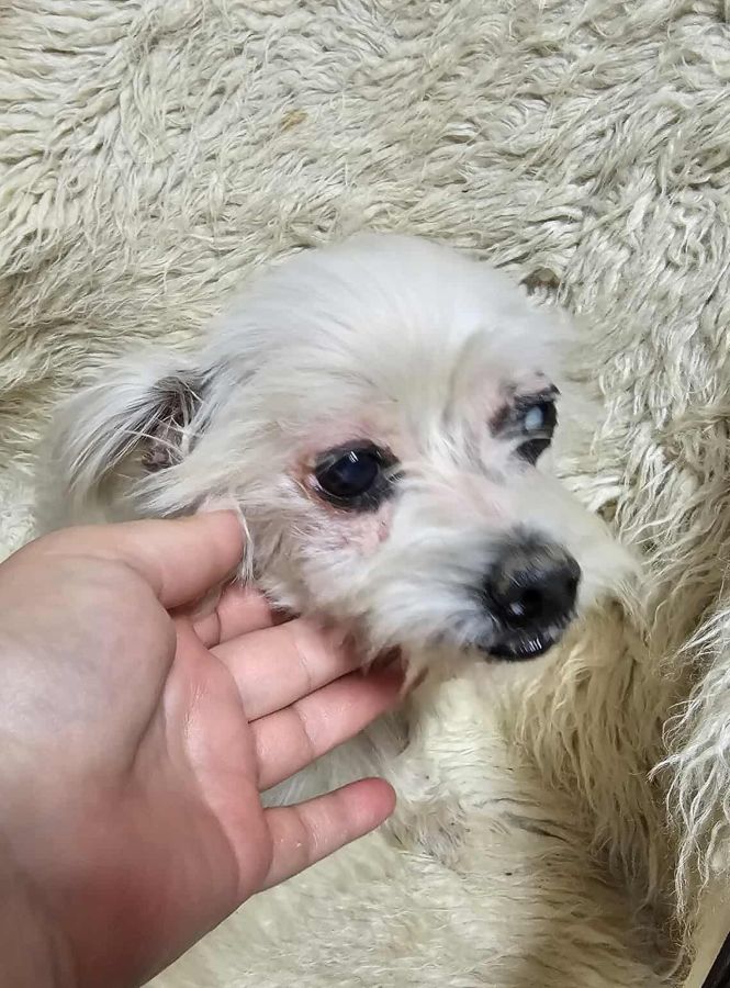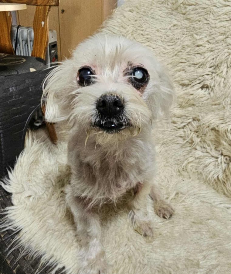 Die zarte Malteser-Bichon-Mix-Oma SCOURY ist neu im Shelter gelandet. Sie hat ein paar altersbedingte Zipperlein, auf einem Auge ist sie durch den grauen Star erblindet, kommt damit aber gut zurecht. Leider kämpft sie auch mit Hautproblemen.