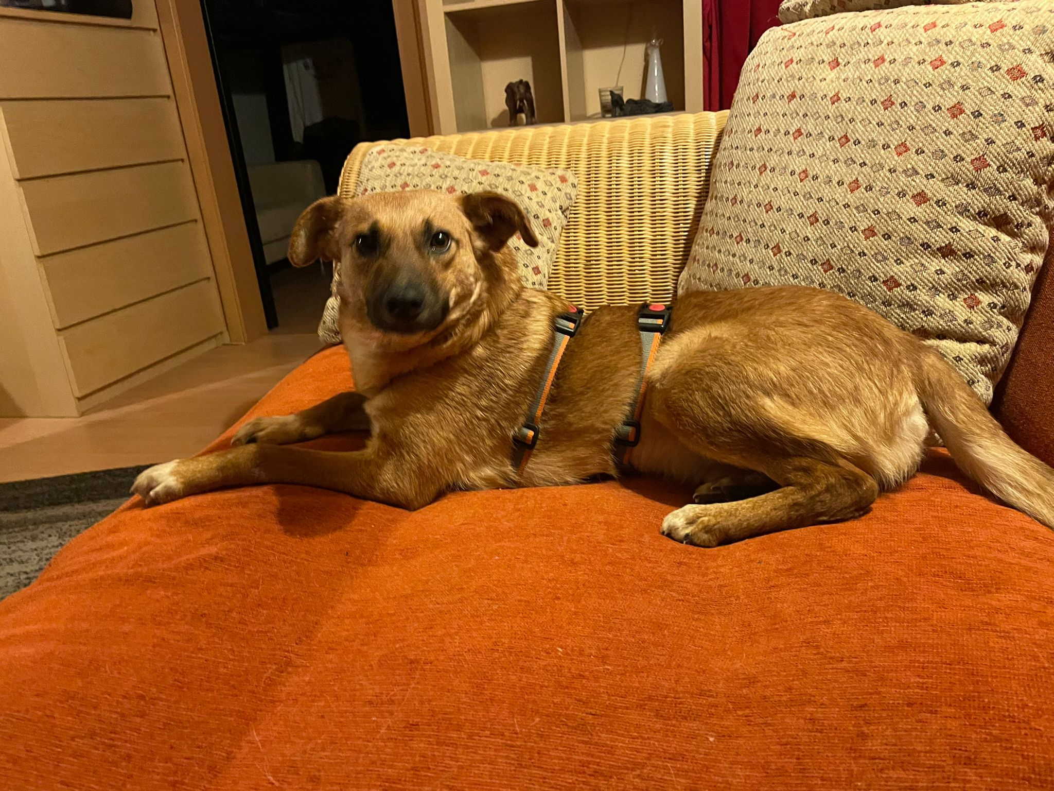 Mittlerweile sucht Scout auf dem Sofa Kontakt zu uns Menschen, um sich Streicheleinheiten abzuholen.