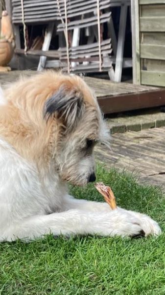 Sie liebt lange Spaziergänge, beginnt nun auch die Sorgen der letzten Jahre zu vergessen und ein wenig zu toben, achtet dabei aber immer auf das andere Ende der Leine!