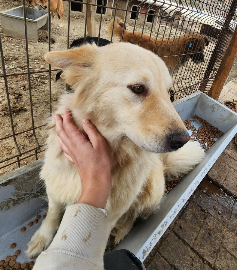 Shanice lag bei unserer Ankunft im Futtertrog. Da sie sich den Kennel mit mehreren, recht aktiven Hunden teilt, hatte man den Eindruck, dass sie sich aus dem Treiben im Zwinger lieber heraushalten wollte. Die ausgeglichene, ruhige Hündin scheint hier in Gesellschaft recht fehl am Platz und sehnt sich nach einem ruhigeren Plätzchen. Es ist außerdem aufgefallen, dass ihr Ballen aufgrund der eingewachsenen Wolfskrallen angeschwollen war.