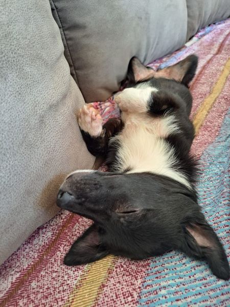 Sie ist inzwischen fast stubenrein und kann problemlos mehrere Stunden einhalten. Und falls doch mal niemand die Tür nach draußen öffnet, benutzt sie zielsicher die ausgelegten Unterlagen.