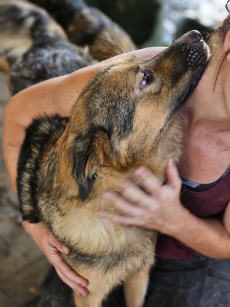Nach kurzer Zeit merkte sie aber, dass wir ihr und ihren Welpen absolut nichts Böses wollten und zeigte sich von da als sehr freundliche und sehr menschenbezogene Hündin, die gerne unsere Leckerchen nahm und unsere Streicheleinheiten genoß. Sie war problemlos überall anfassbar.