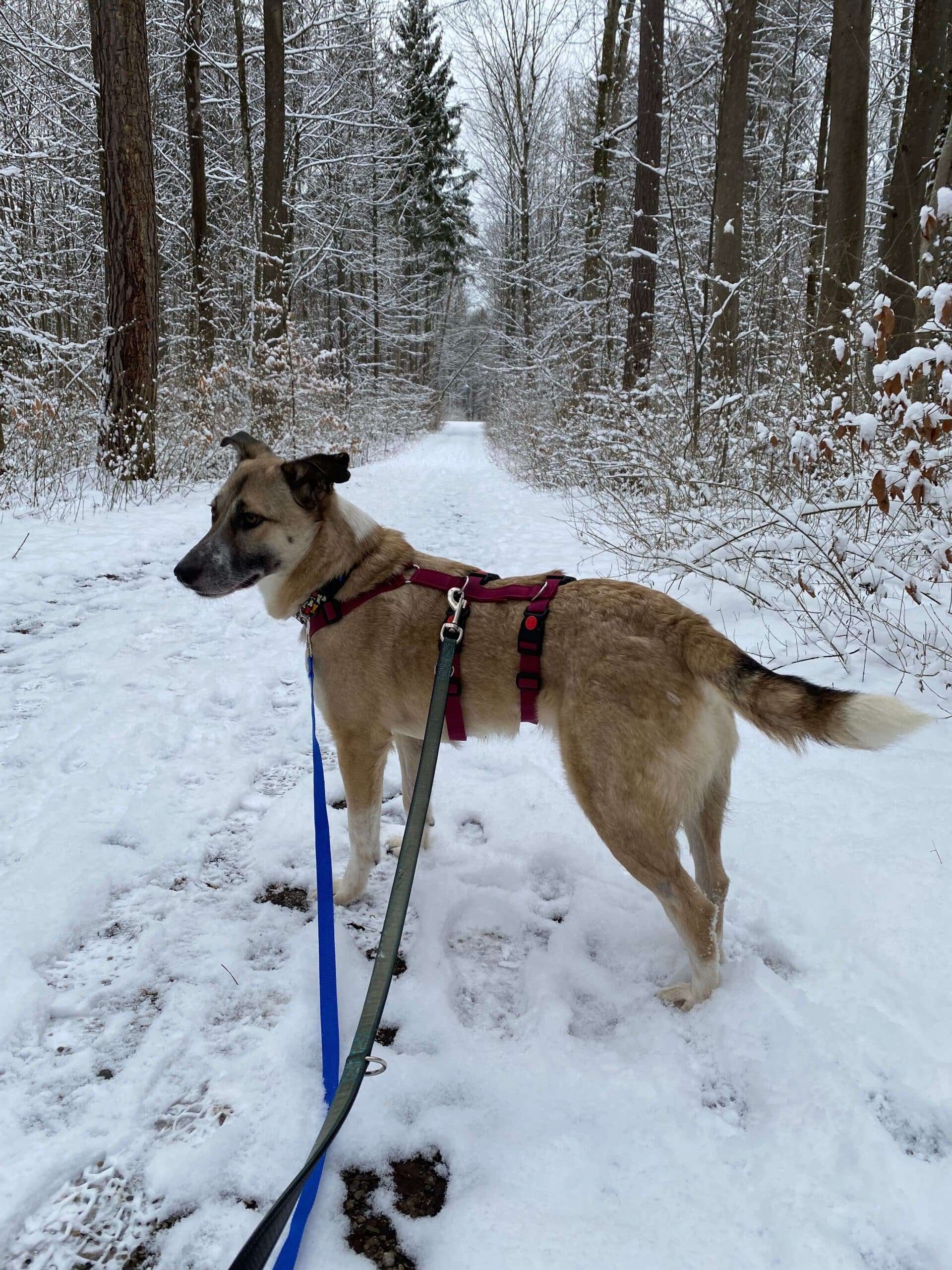 Sheku liebt lange Spaziergänge, er läuft bereits sehr gut an der Leine, das Abrufen ohne Leine wurde noch nicht geübt, da Sheku aus Sicherheitsgründen nur mit doppelter Sicherung (eine Leine am Halsband, eine weitere Leine am Geschirr) Gassi geht und dies sicherlich noch einige Zeit in Anspruch nehmen wird.