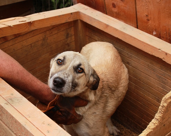 SHEKU lässt sich hochnehmen und bleibt dabei gelassen. An der linken Hinterhand hat er eine frische Bissverletzung, die Irina und Team bereits behandelt hat. Sein langes Ohr ist ausgerissen. Husten hatte er keinen mehr.