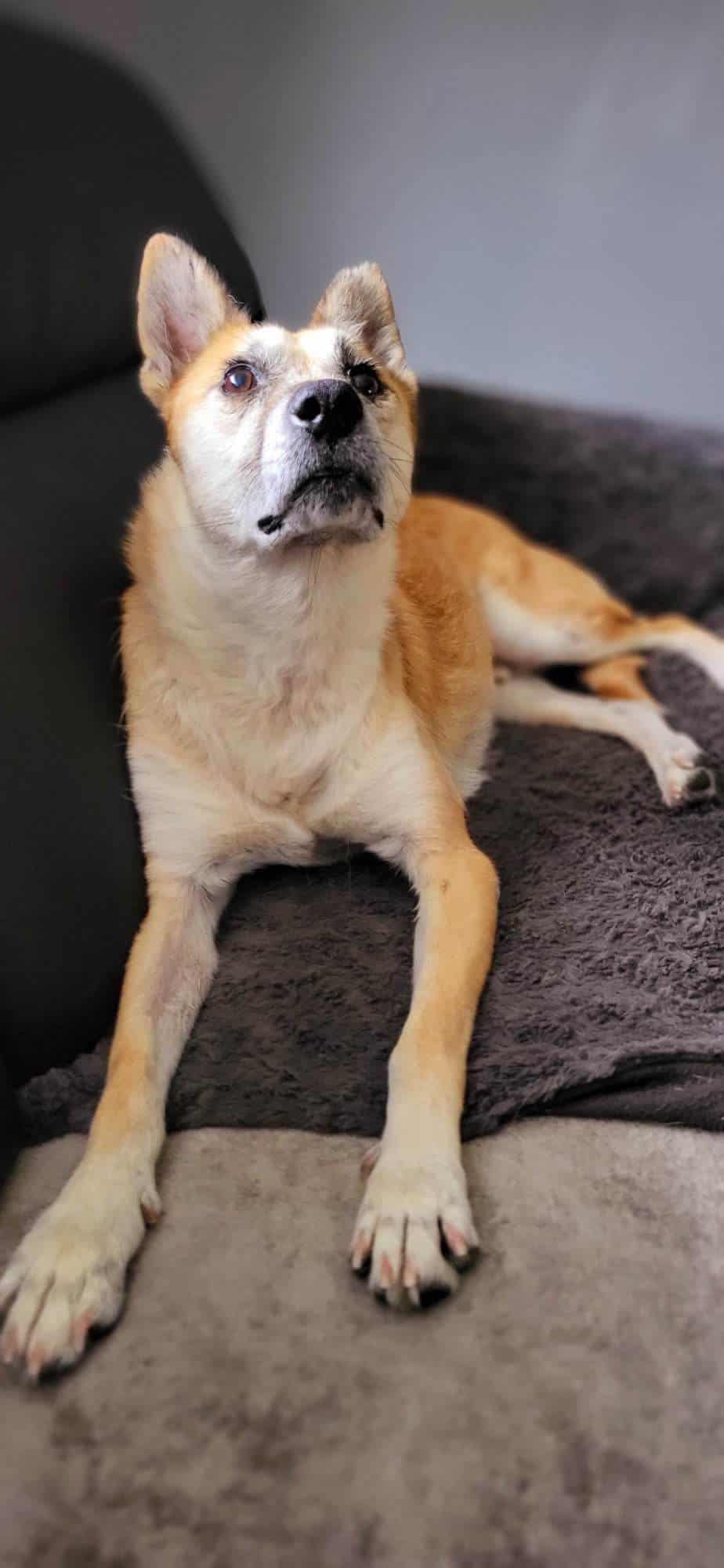 Er ist mit allen Hunden verträglich, Katzen kennt er auch, Besucher interessieren ihn noch nicht so, da bleibt er in seiner Komfortzone auf dem Sofa liegen.