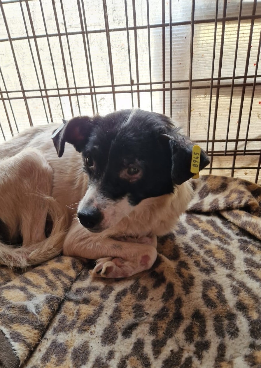 Die gebeutelte Hündin nimmt Futter aus der Hand, ansonsten ist sie aber schüchtern. Unter Bedrängung ist sie vorsichtig anfassbar, Futter nimmt sie aus der Hand.