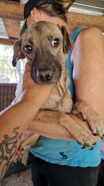 Sie lässt sich auf den Arm nehmen und streicheln, ohne Abwehrverhalten zu zeigen, ist aber insgesamt sehr zurückhaltend und weicht aus, wenn sie die Möglichkeit hat. Ihr fehlen deutlich Erfahrungen mit Menschen, aber sie ist freundlich und aktuell in einer Notsituation. Wir denken, dass sie in erfahrenen Händen noch gut auftauen wird.