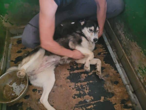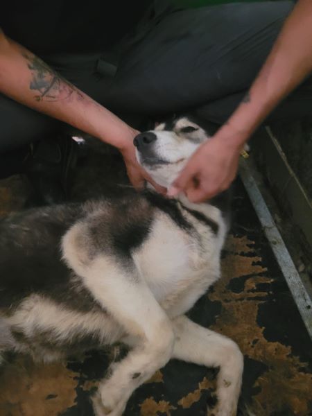 Sehr zutrauliche und nette Huskymischlingsdame. Sie legte sich sogar auf den Boden, damit wir sie überall am Bauch streicheln konnten. Mit ihrem Zwingerkumpel verstand sie sich gut.