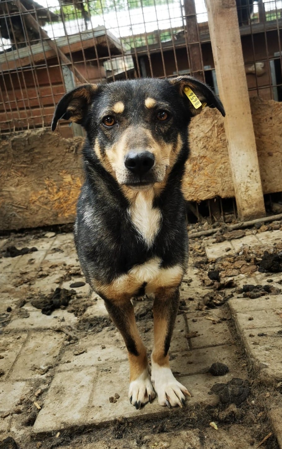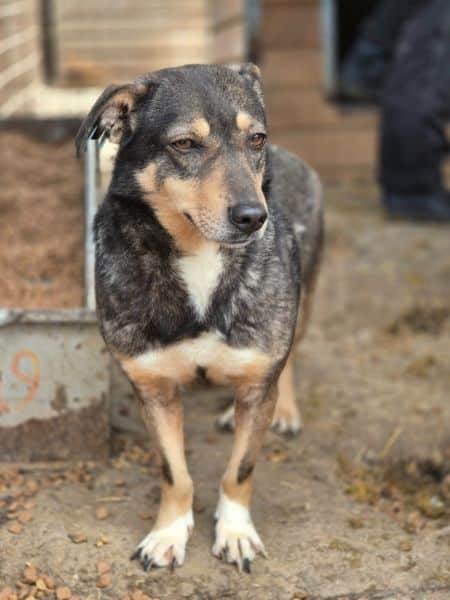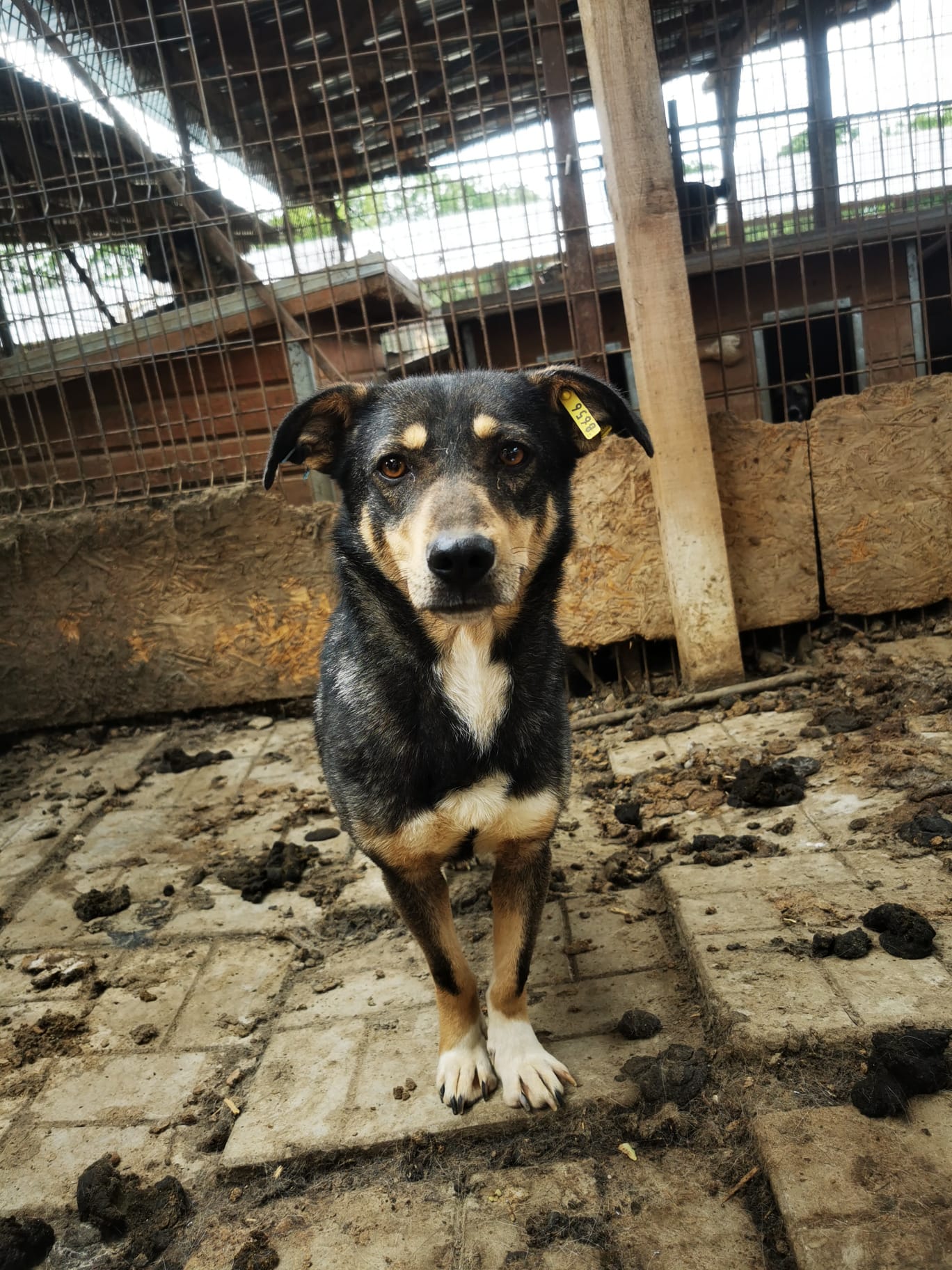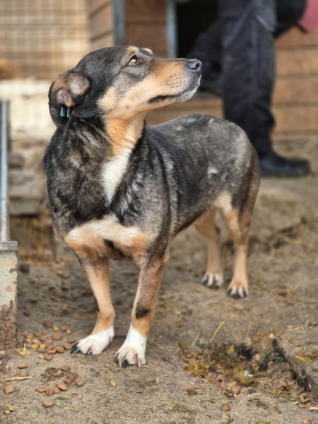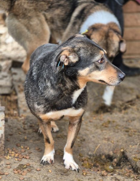 Diese freundliche Hündin mit dem hübschen Gesicht war sehr neugierig und interessiert an uns, kam auch recht nah ran um sich Leckerchen zu holen. Leider fehlt ihr noch der Mut und gute Erfahrungen um sich von uns streicheln zu lassen. Zusätzlich machte ihr der Trubel im Kennel zu schaffen, da sie dort hauptsächlich mit großen, aufgeweckten Hunden lebt. In einer ruhigen Umgebung mit verständigen Menschen wird sie sicherlich schnell Vertrauen fassen.