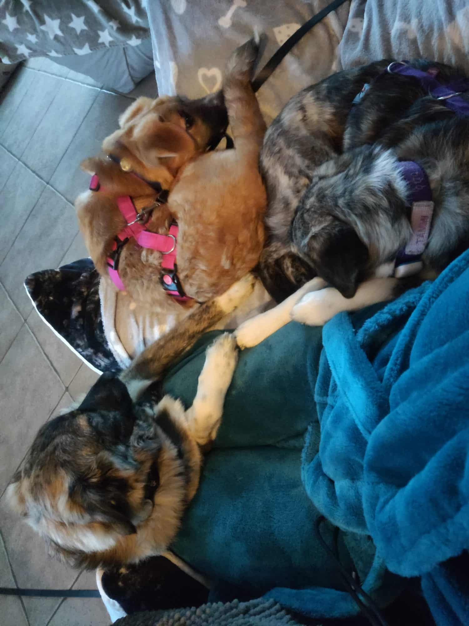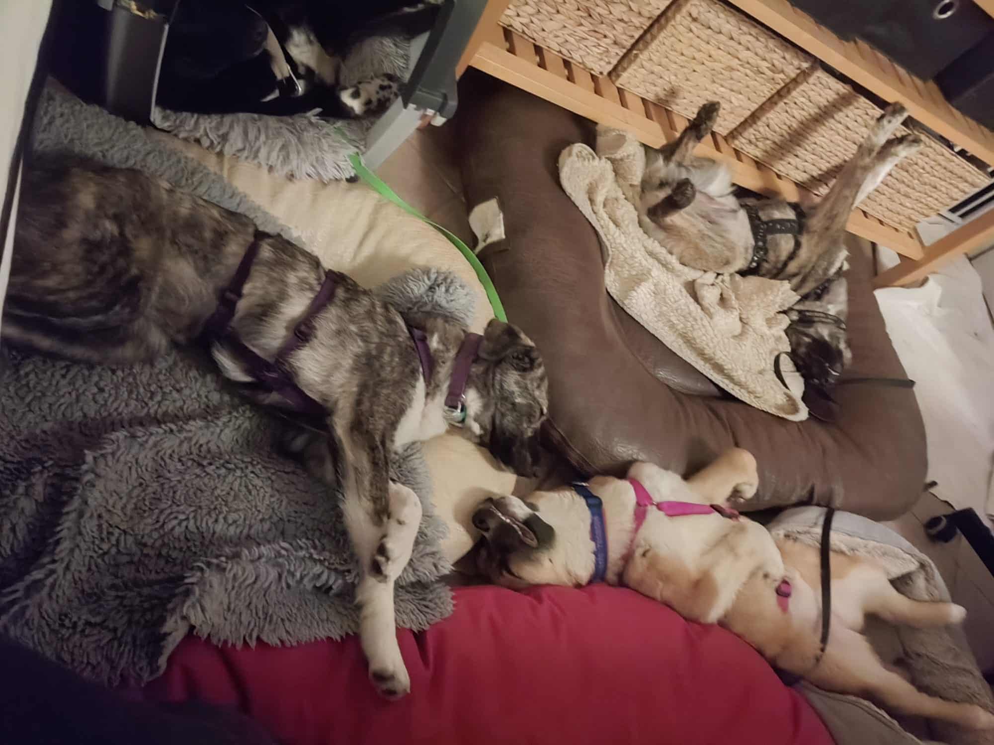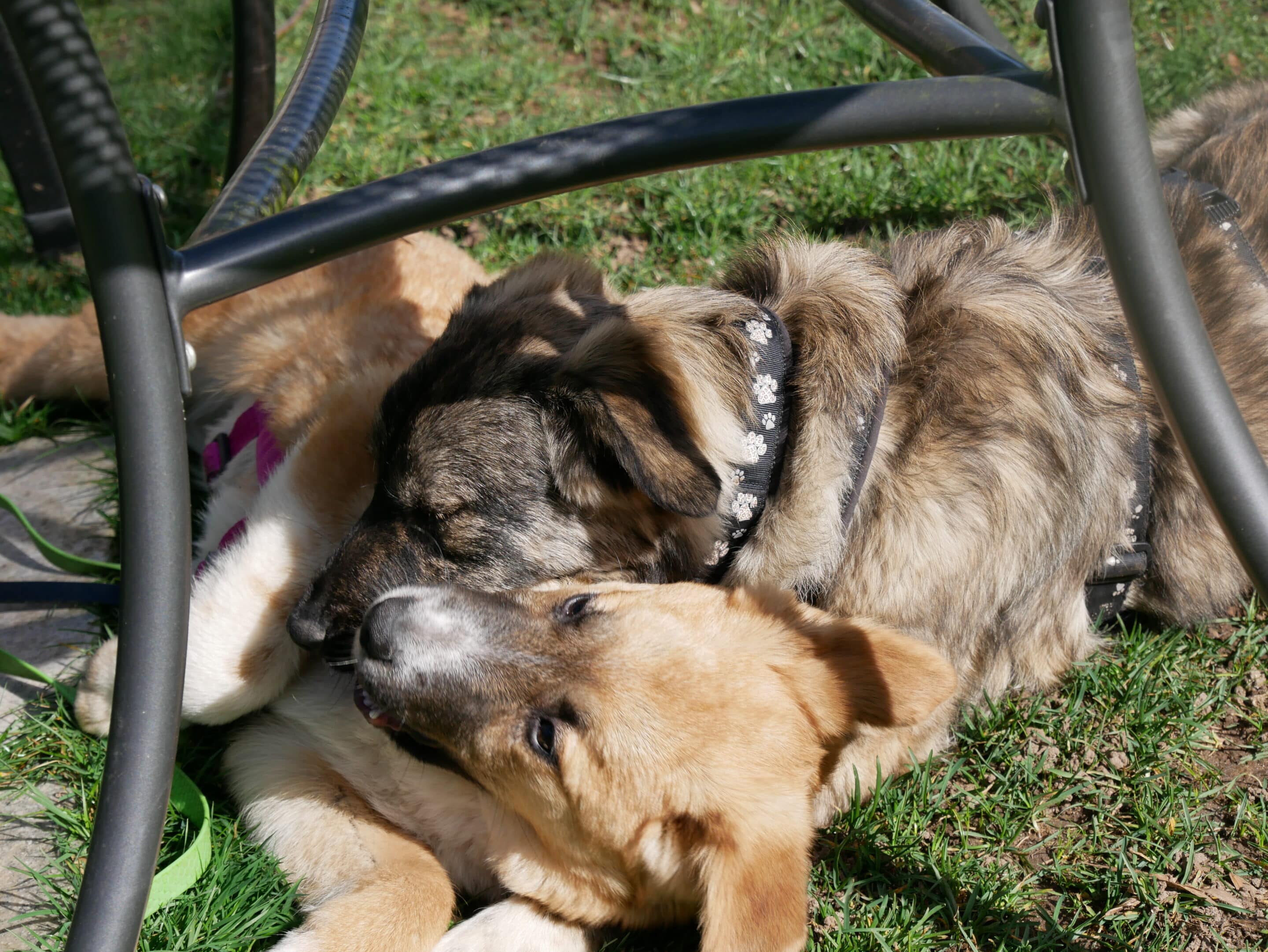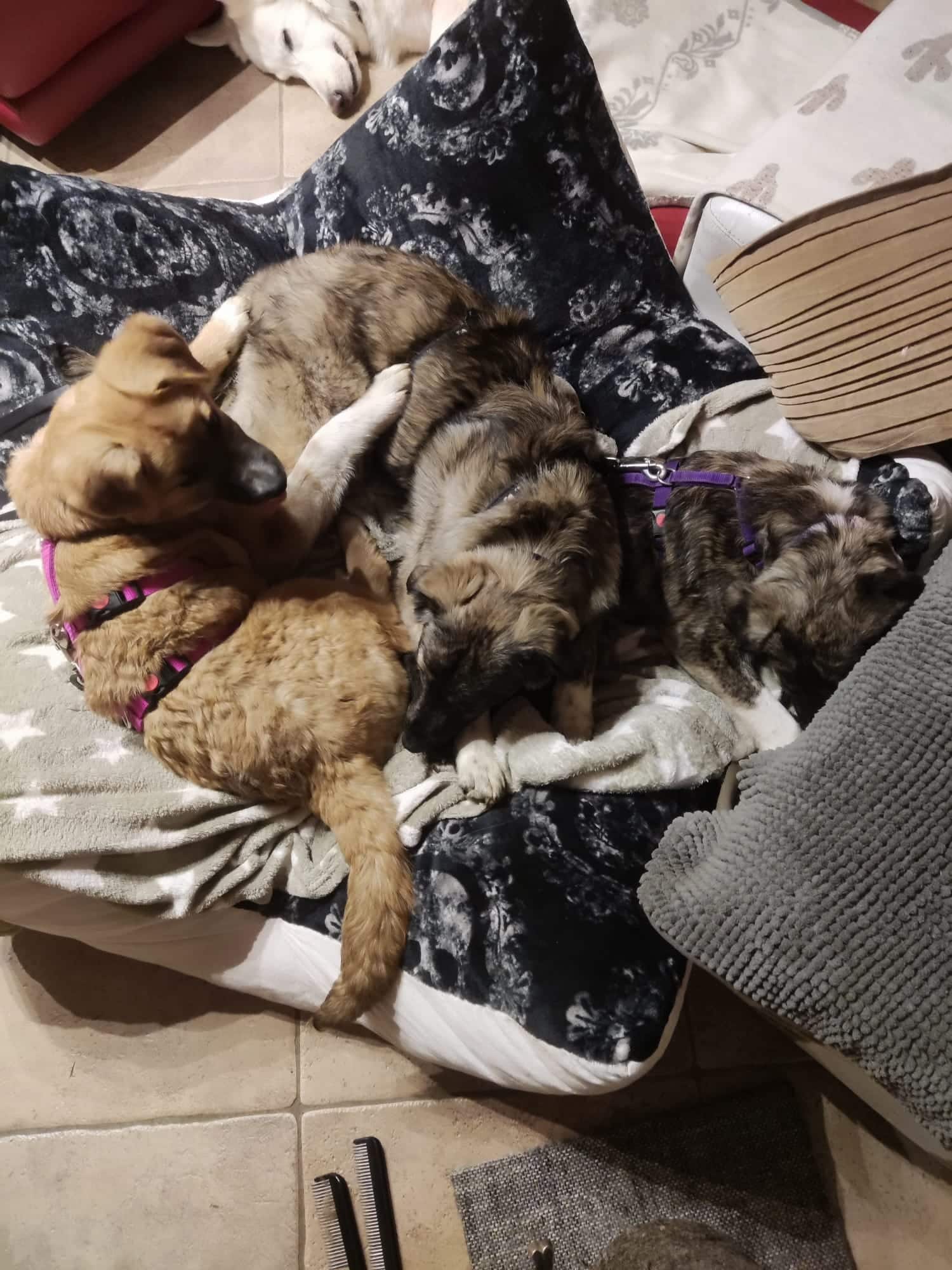 Auch Siri kommt hier im Rudel prima klar, kann die Hundesprache und verhält sich entsprechend. Als liebste Freundin hat sie sich hier nicht wie erwartet ihre Blutsschwester Tammi, sondern Panina, nun ihre Herzensschwester, ausgesucht. Wo die eine ist, ist die andere nicht weit. Sie teilen sich gerne ein Körbchen, beherrschen den rumänischen Knoten im Doppelpack. Siri ist stubenrein, kann im Auto entspannt mitfahren, ist im Home Office ruhig dabei, schläft nachts durch. Sie ist nicht futterneidisch, neigt aber zum klauen, wenn sie vor ihren PS-Schwestern fertig ist.