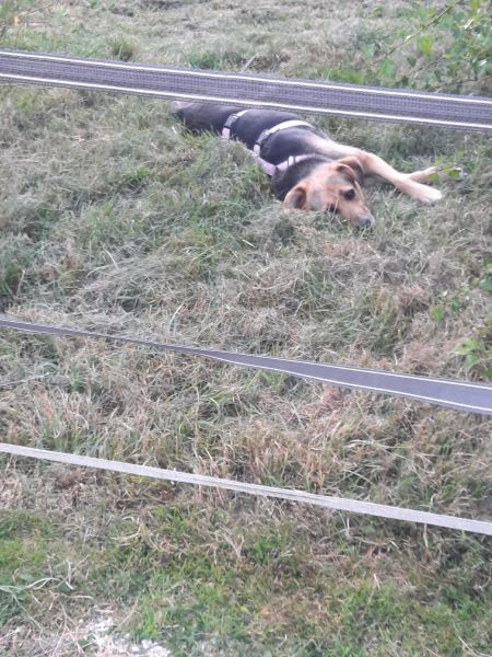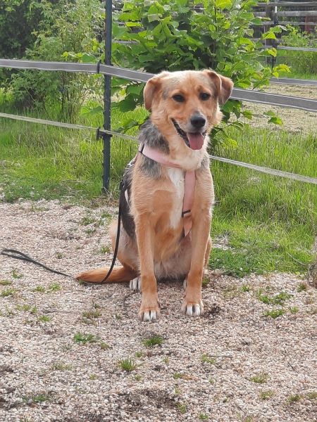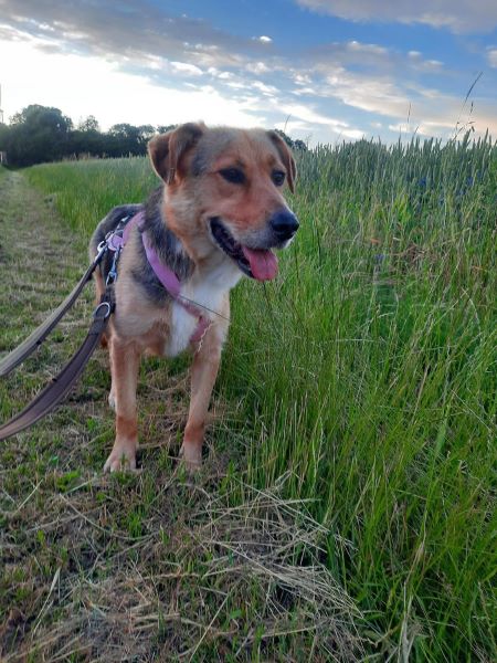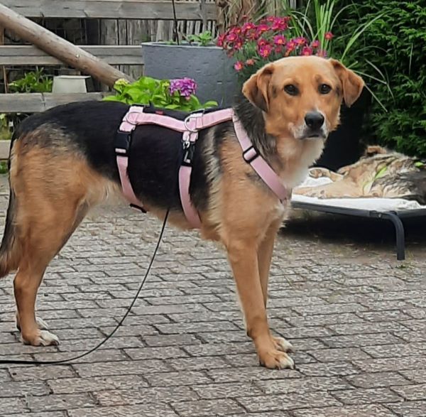 Unterwegs ist von ihrer Scheu kaum noch etwas zu bemerken, zumindest so lange es durch Feld und Wald geht, im Wohngebiet, vor allem bei vorbeifahrenden Autos, wird sie dann wieder deutlich unsicherer, aber auch hier hat sie schon große Fortschritte gemacht und es wird weiter fleißig geübt.
