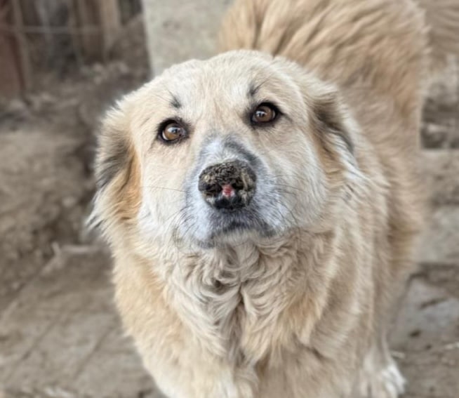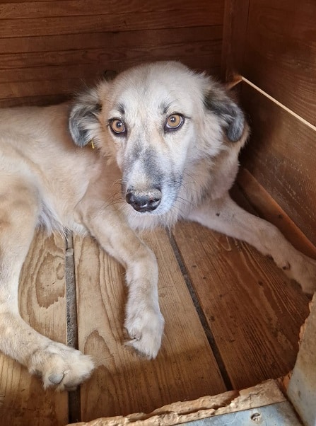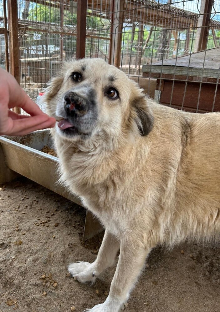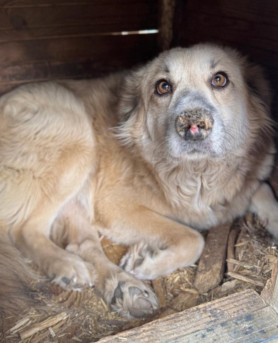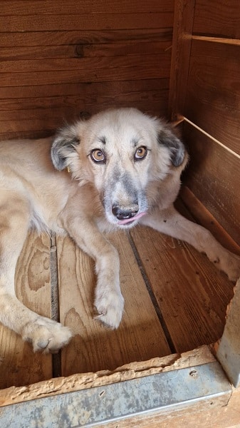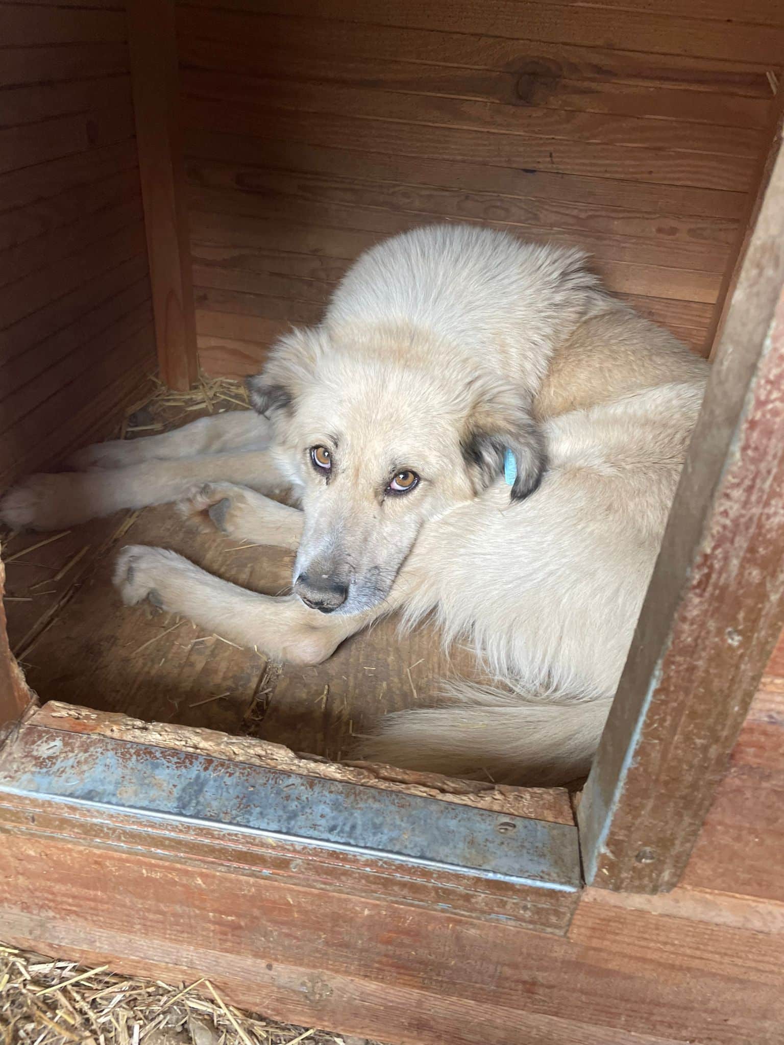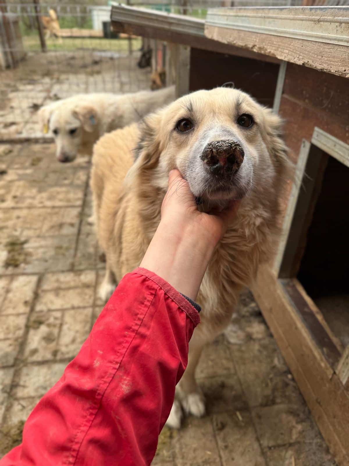 SLATKO lag während unseres Besuches entspannt in seiner Hütte und beobachtete uns. Wir konnten ihn nicht bewegen, die Hütte zu verlassen – daher können wir leider auch nichts zu seinem Gangbild sagen. Vielleicht war ihm das alles einfach zu viel Trubel, er scheint eher der gemütlichere Typ zu sein, oder vielleicht beeinträchtig ihn auch gerade, dass er doch schwer Luft bekommt. Unsere Tierschützerin vor Ort ist informiert und beobachtet das. SLATKO ist gut und überall anfassbar, freundlich und freute sich über unsere Leckerlies. Mit anderen Hunden ist SLATKO gut verträglich.