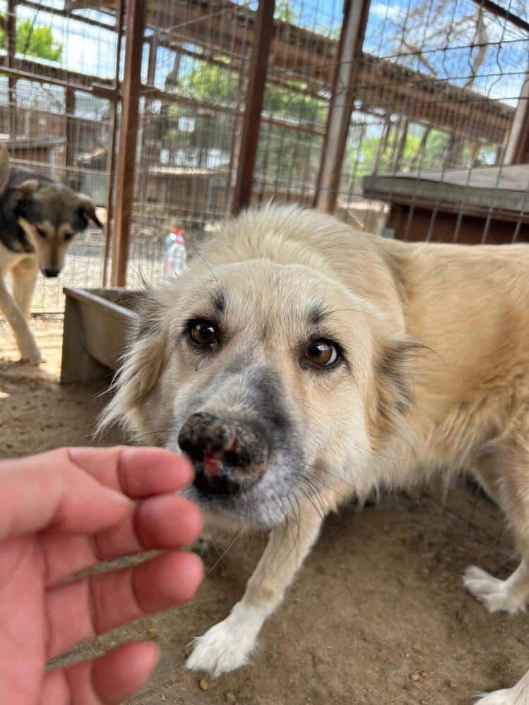 SLATKOS Nase sieht inzwischen leider total schlimm aus – woran es liegt, wissen wir nicht. Er ist uns gegenüber weiterhin unsicher, aber neugierig. Er nahm gerne unsere Leckerlies und wir konnten SLATKO gut streicheln, auch wenn er sich noch unwohl dabei fühlt.