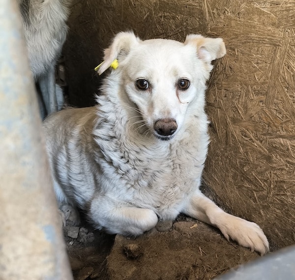 Als wir in den Kennel gegangen sind, versteckte sie sich seitlich neben der Hütte, beobachtete uns aber.