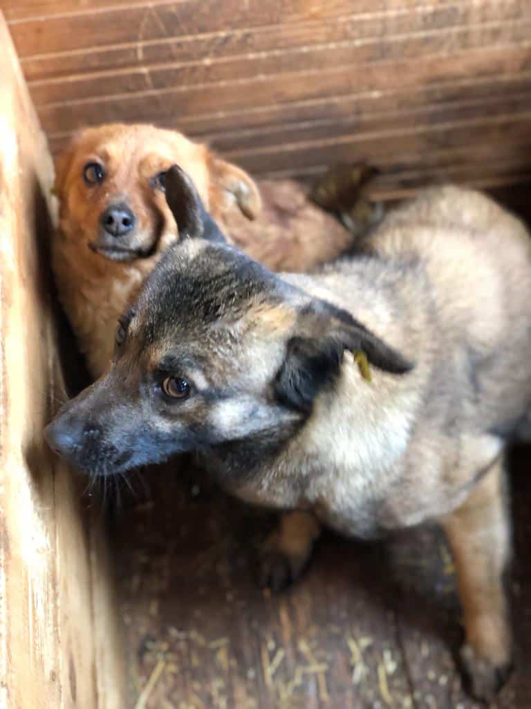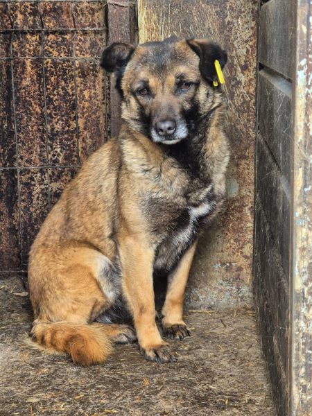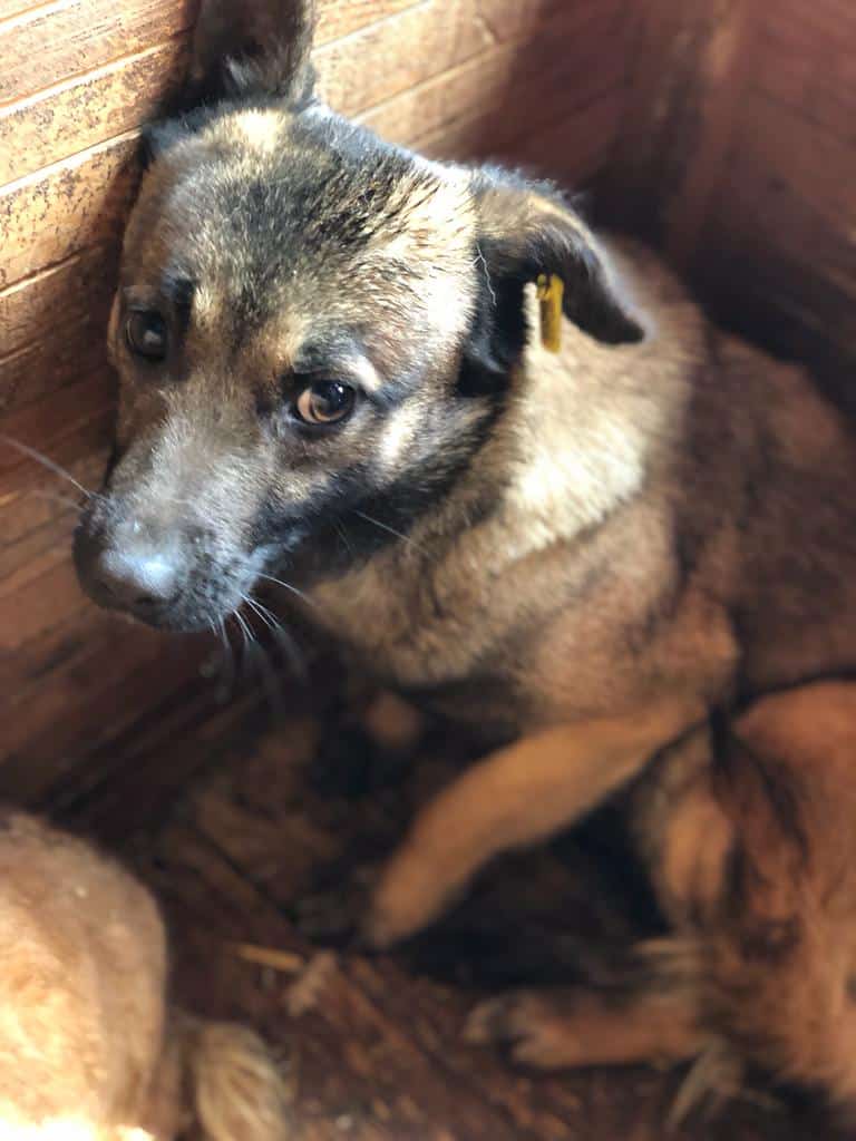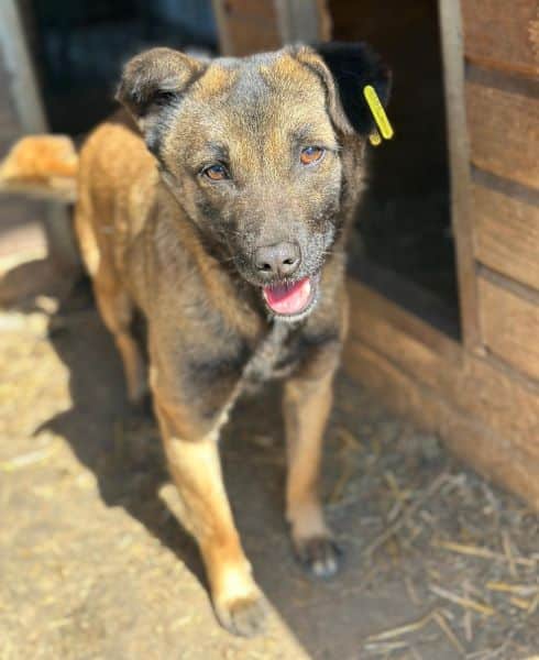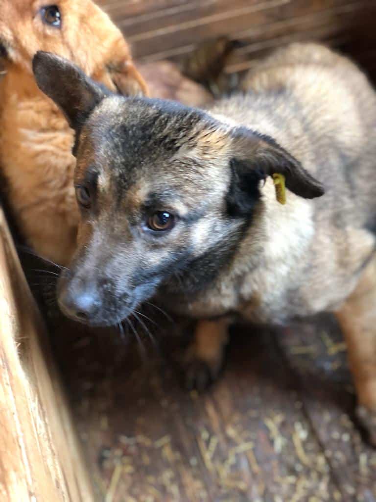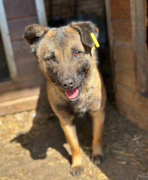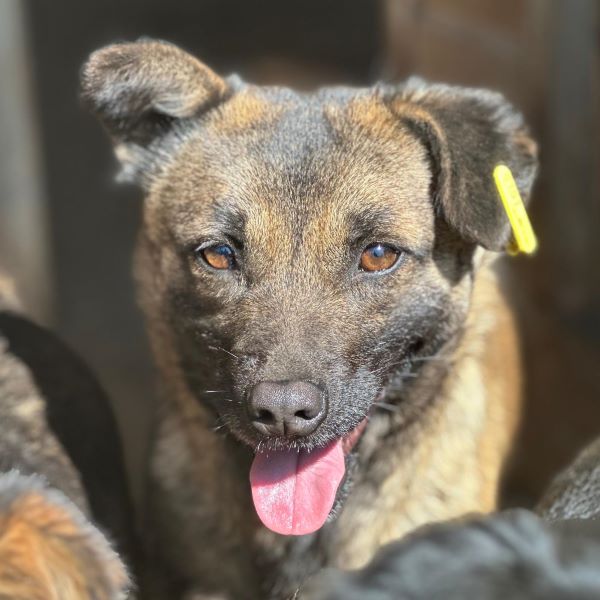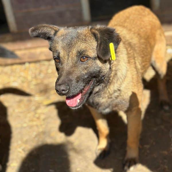 Junge Hündin mittlerer Größe, die sich leider sehr scheu zeigte. Wir konnten sie nicht anfassen, da sie sofort panisch flüchtete. In der großen Hundegruppe ist sie sehr verträglich.