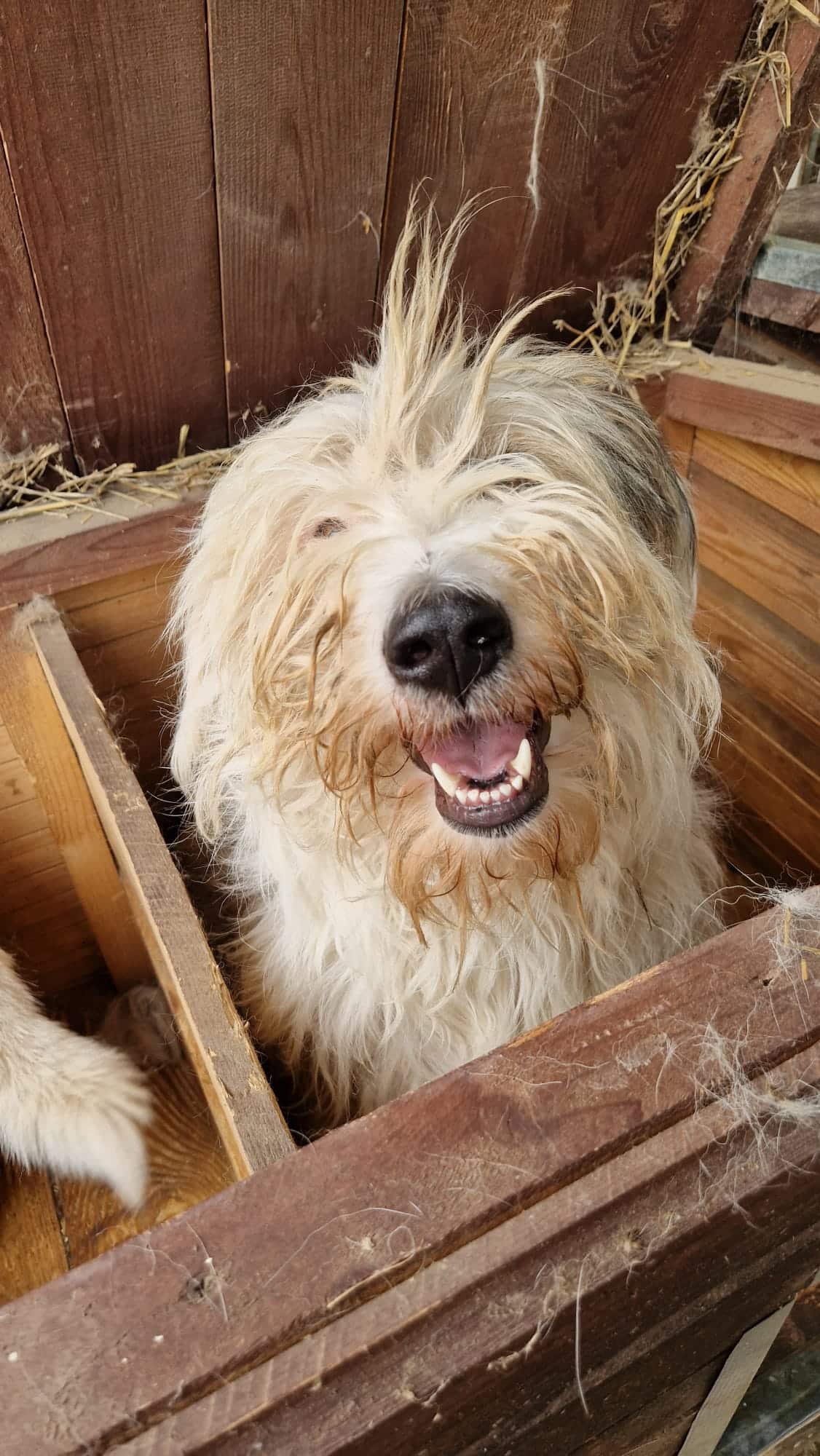 SOUNDY’s Fell sieht furchtbar aus und es tat und sehr leid, sie so zurückgezogen in ihrer Hütte zu sehen. Auch zugenommen hat sie, was soll sie außer fressen auch tun? Scheinbar hat sie keine Hoffnung mehr. Mit ihrem Kennelkollegen, die alle ausnahmslos sehr nett auch miteinander sind, hat sie überhaupt keine Probleme.
