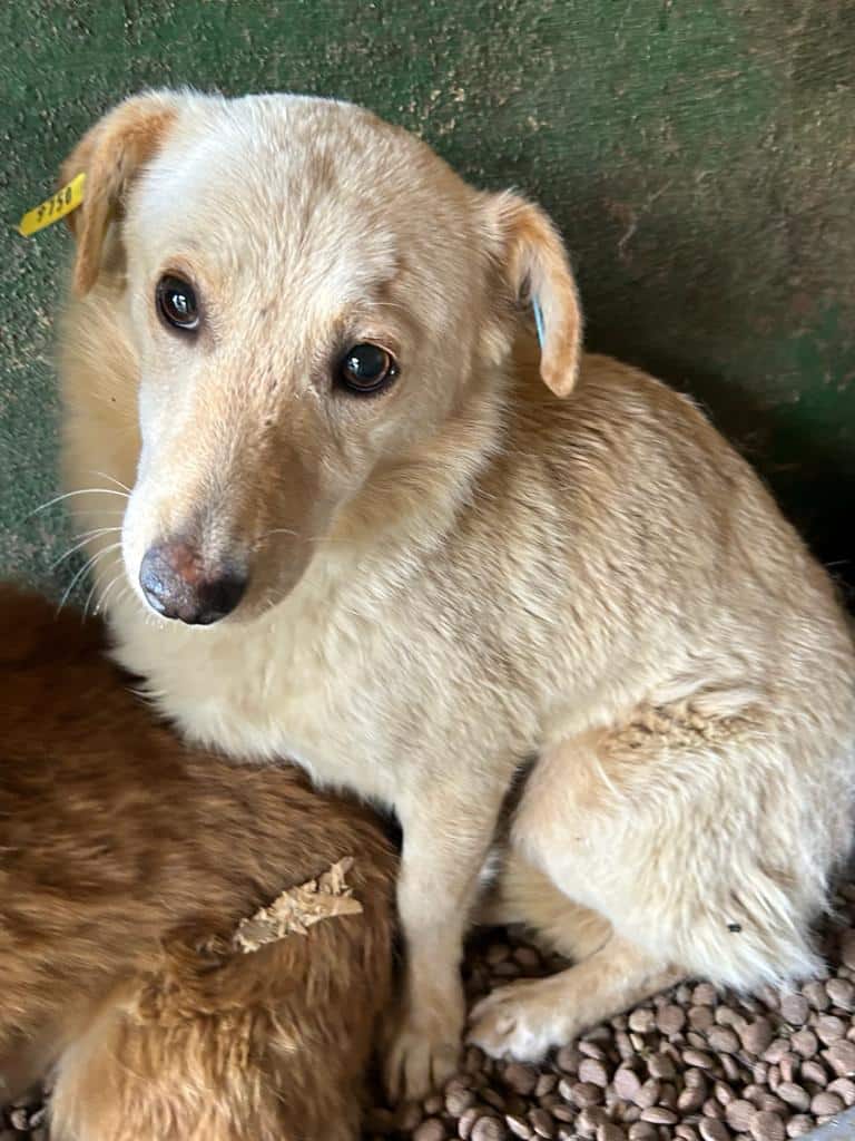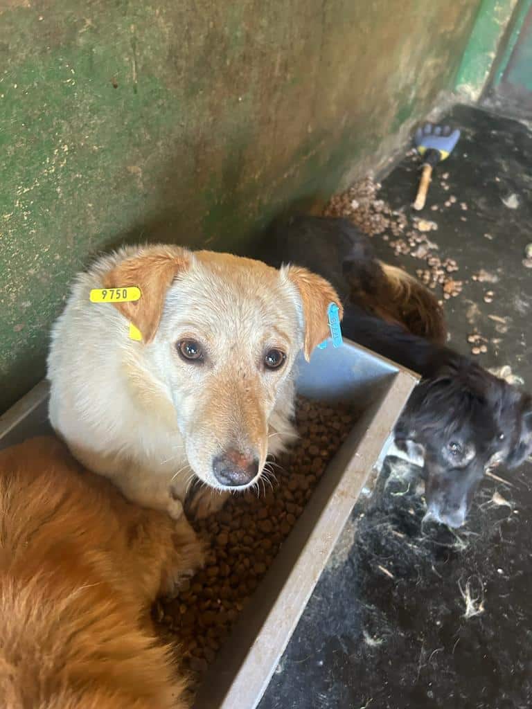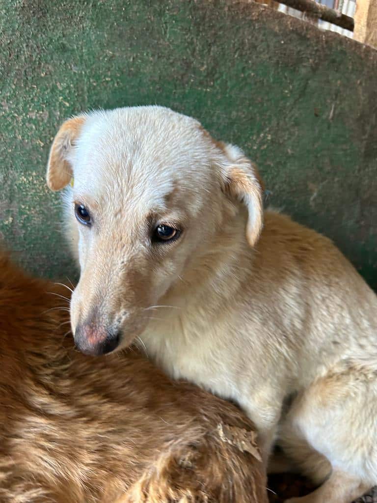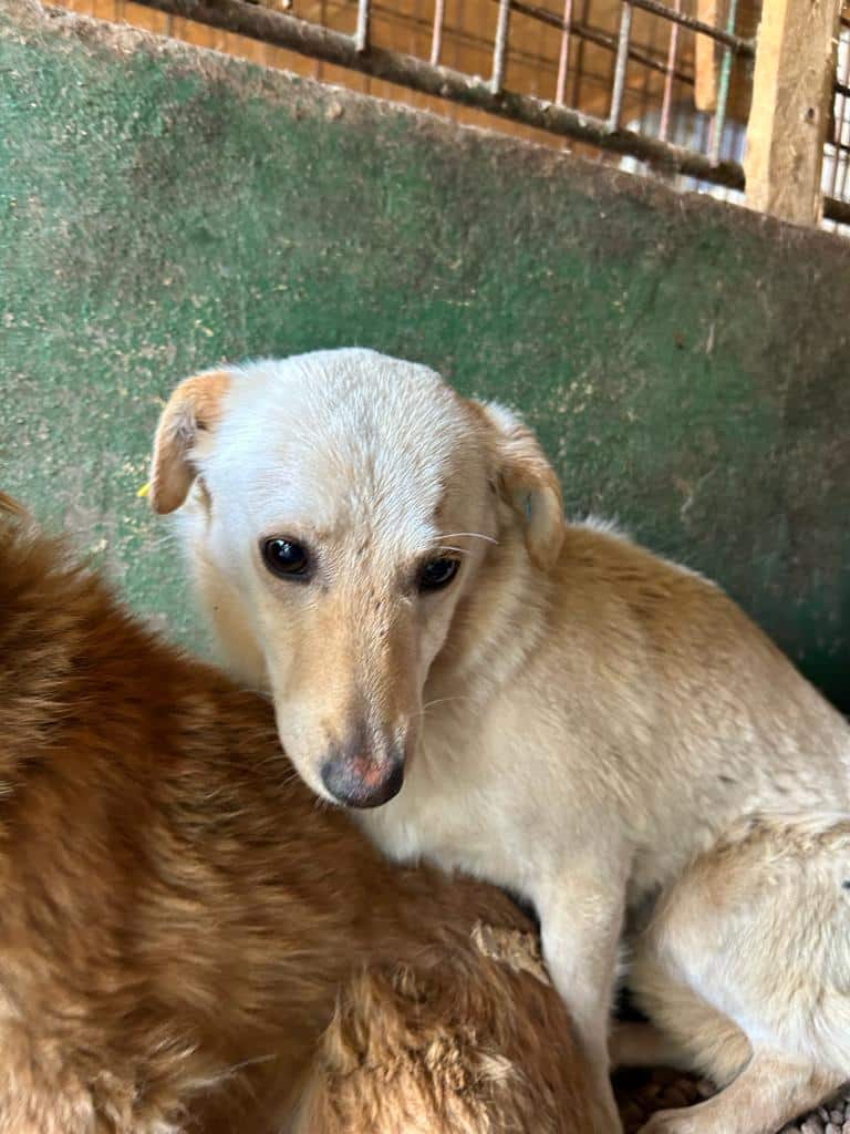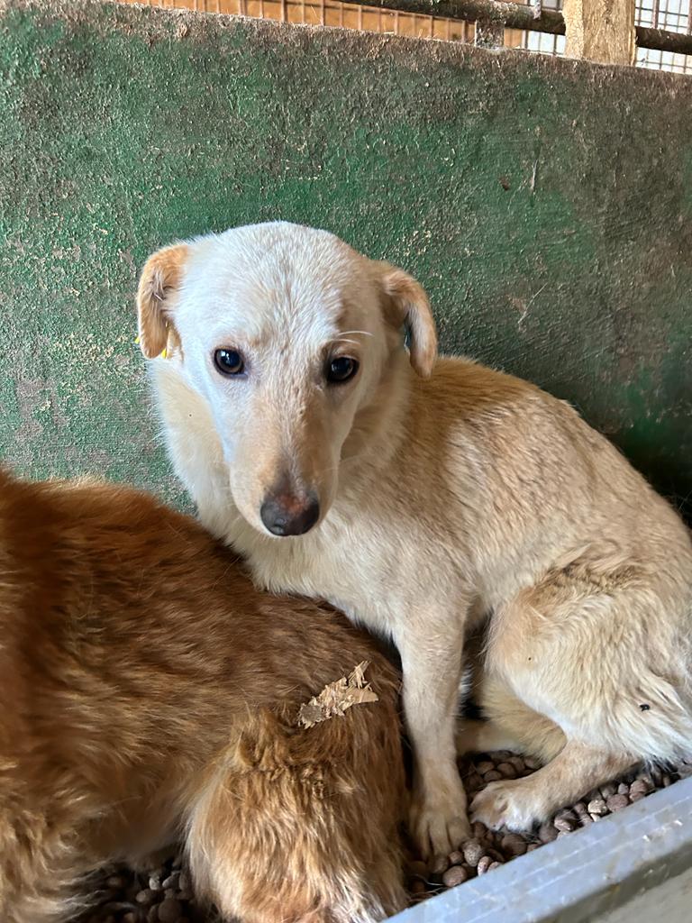 die zierliche blonde Hündin war sehr besorgt, als wir uns ihr näherten – sie wich aus und klemmte sich in den Futtertrog, suchte Schutz bei ihrem Kennelkollegen