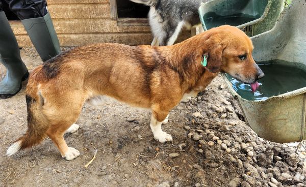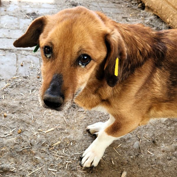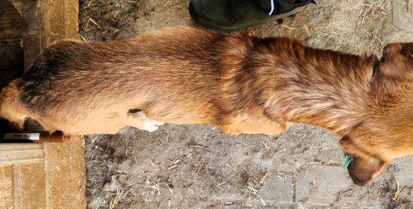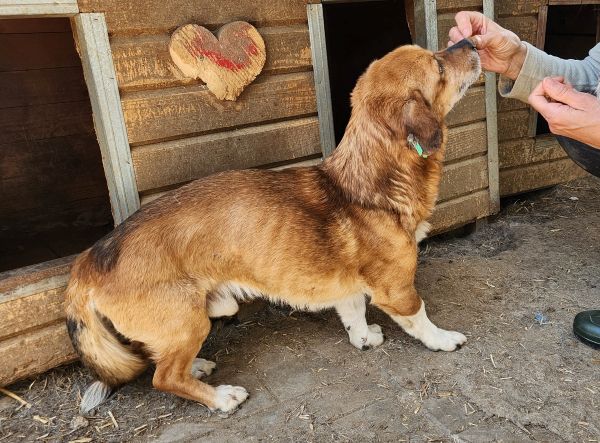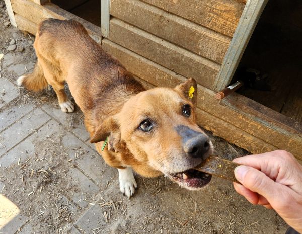 Dieser zurückhaltende Rüde war anfangs vorsichtig im Umgang mit uns Menschen. Er ließ sich in der Hütte zwar anfassen, man merkte ihm aber an, dass er sich dabei unwohl fühlte. Mit den dargebotenen Leckerchen taute er langsam auf und kam aus der Hütte. Beim Anblick des kleinen Rüden bot sich uns ein erschreckender Anblick, da er kaum etwas auf den Rippen hat. Zudem sind seine Augen entzündet. Nach und nach taute er auf und nahm gerne die dargebotenen Leckerchen an. Wir hoffen, dass der Rüde diesen trostlosen Ort bald verlassen und in Geborgenheit ankommen darf.