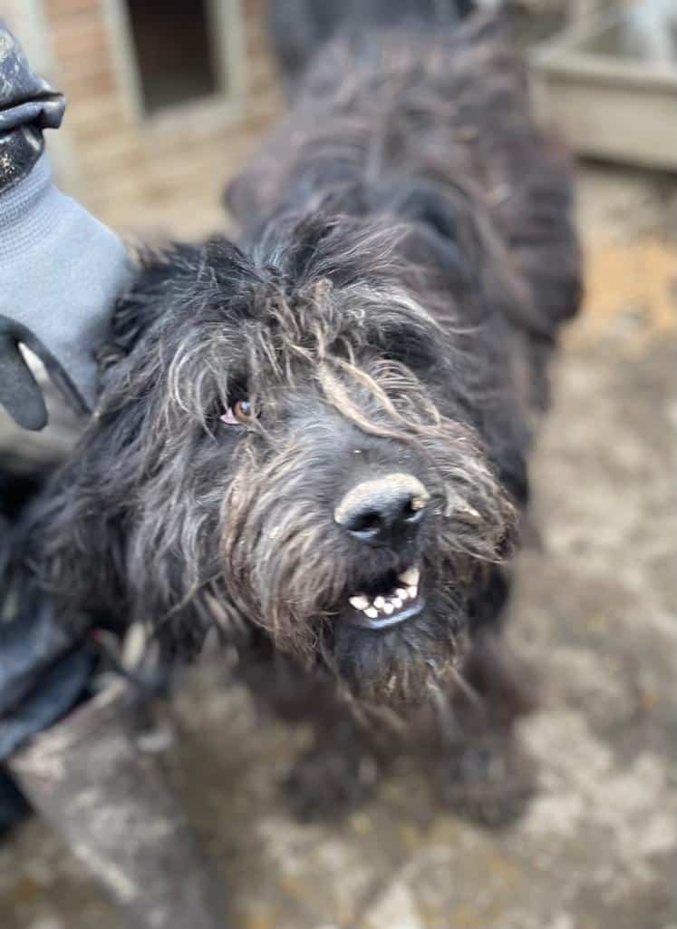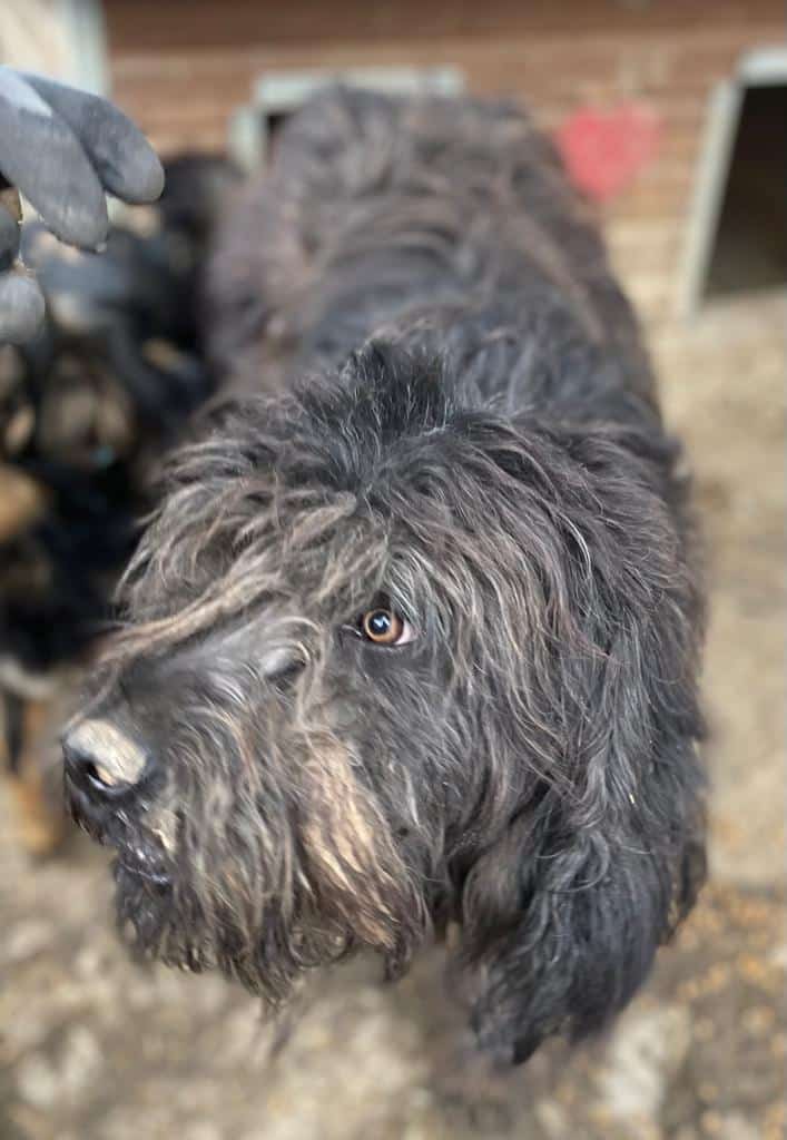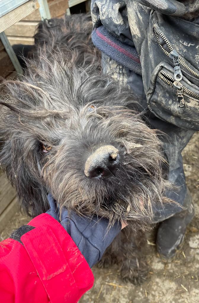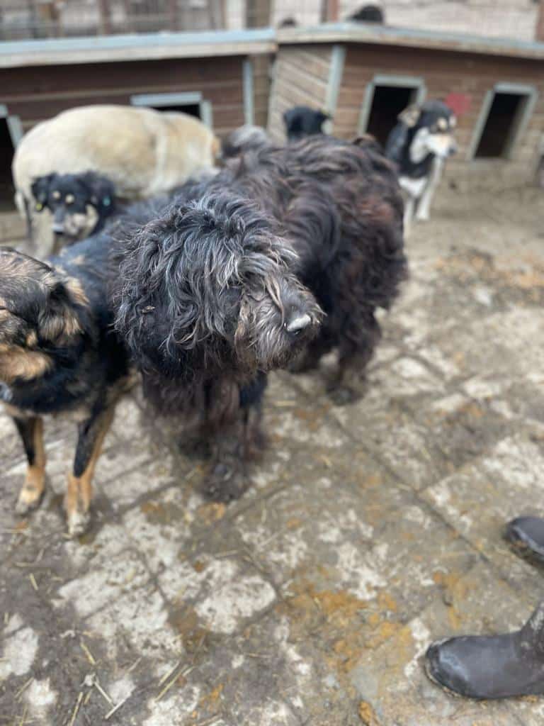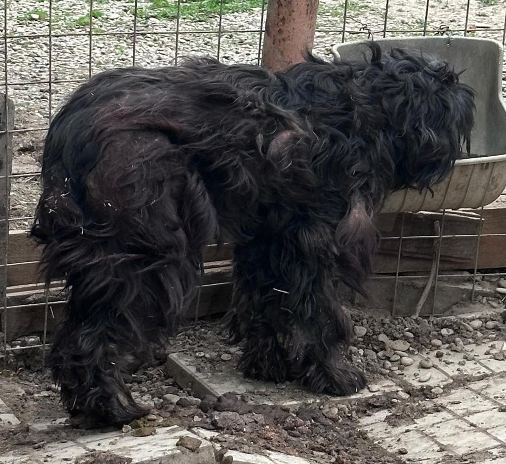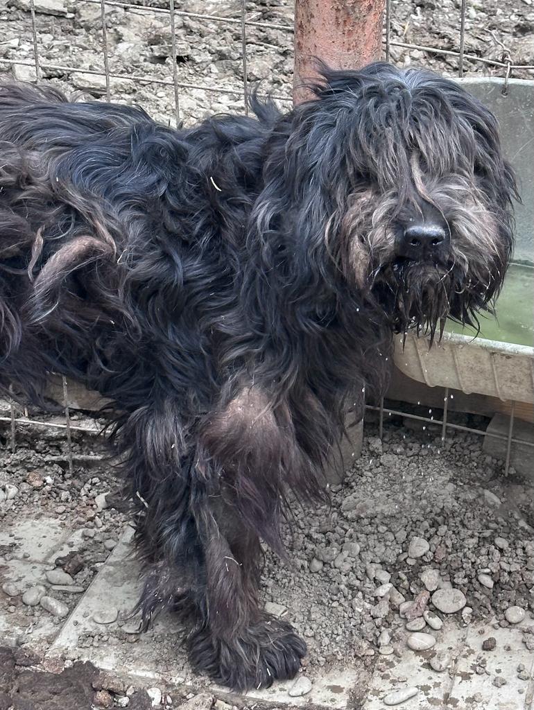 Strolchy hat uns sehr bewegt, bei ihm sieht man vor lauter Filz und Dreck gar nicht, dass er nur noch Haut und Knochen ist. Das ganze Ausmass hatten wir erst gesehen, als wir ihn von seinen Filzplatten befreit haben. Er ist so fertig, weil er nicht ans Futter und Wasser kommt. Als wir in den Zwinger kamen, ist er gleich aus seiner Hütte gekommen und wollte fressen. Er wurde jedoch sofort wieder in die Hütte zurück getrieben. Wir haben ihm dann Futter in die Hütte gelegt und er hat sich erst einmal ausgiebig satt gefressen. Danach ist er unter unserem Schutz ans Wasser und hat minutenlang getrunken.
