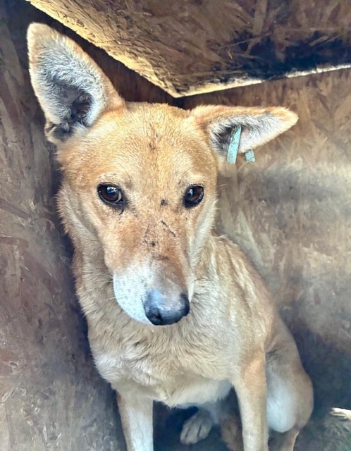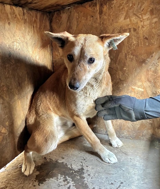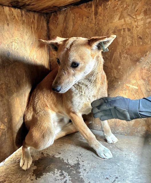 SUELLA wurde gebissen und aufgrund ihrer schlimmeren Verletzungen in die Klinik gebracht. In der Box lässt sie sich vorsichtig anfassen. Suella sollte – sobald sie wieder reisefähig ist – schnellstmöglich ausreisen dürfen.
