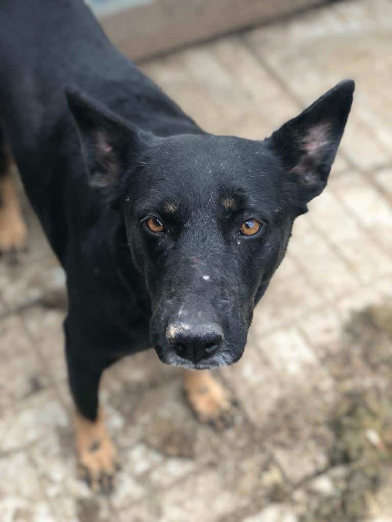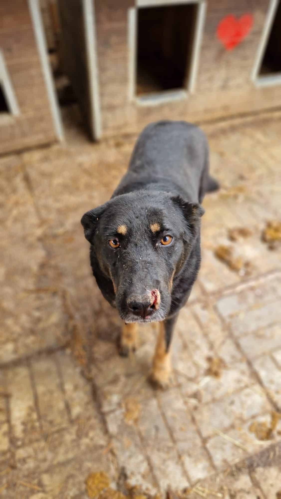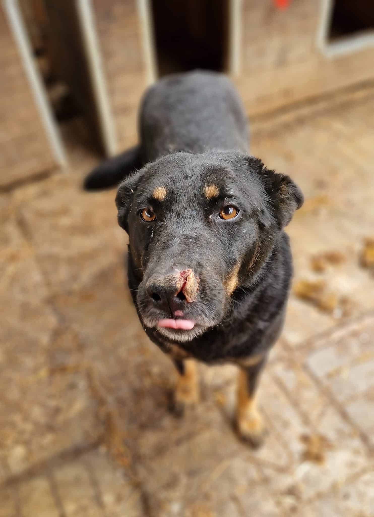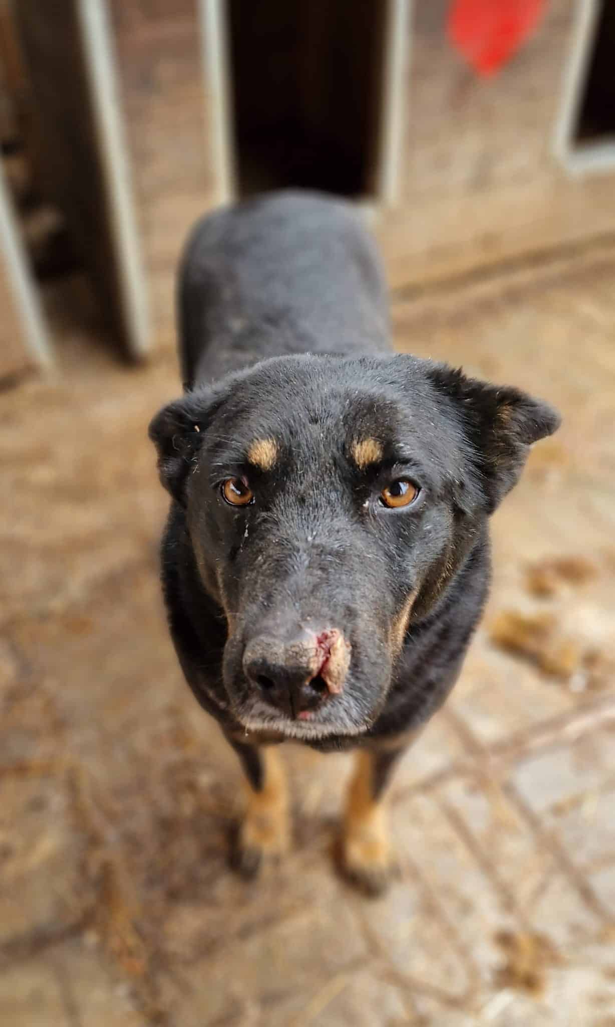 SUMA scheint keinen hohen Stand in ihrem Kennel zu haben und hat aktuell (04/2023) auch eine Wunde an der Nase. Sie wich den anderen Hunden eher aus, sodass wir auch an sie nicht gut rangekommen sind. Sie nahm hastig unser Futter, ist aber nicht zu dünn. Anfassen konnten wir SUMA bei diesem Besuch leider nicht.