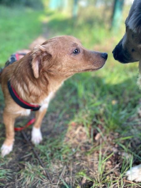 Sunny geht gerne spazieren, wobei er aktuell nur eine reizarme Umgebung im Dorf und den Feldern kennengelernt hat.