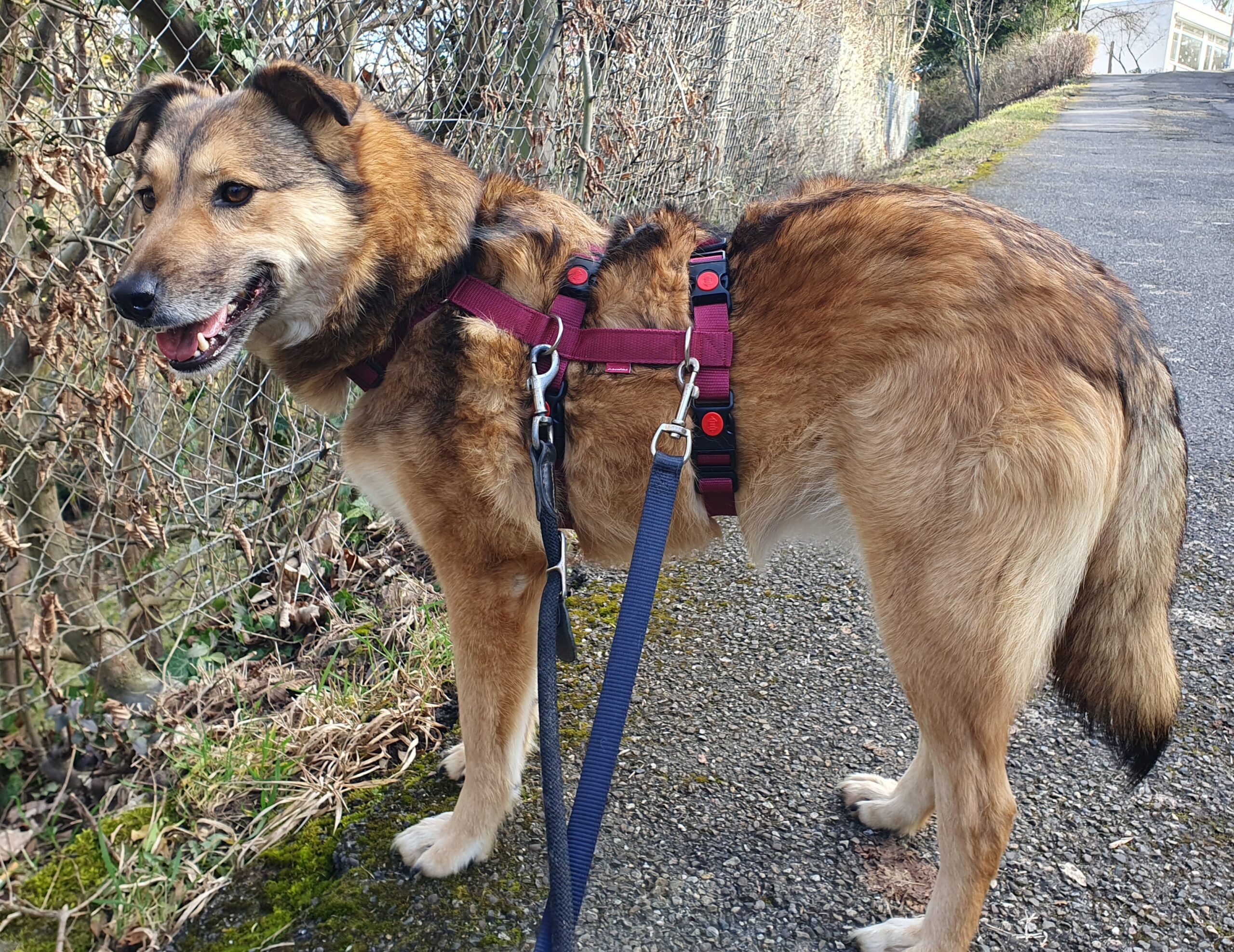Suri läuft sehr schön an der Leine ohne zu ziehen. Auch Hundebegegnungen laufen absolut unspektakulär ab, sie bleibt ruhig und freut sich. Es kann eher mal sein, dass sie unbedingt „Hallo„ sagen möchte und dann vielleicht mal etwas jammert.