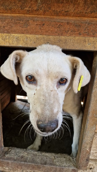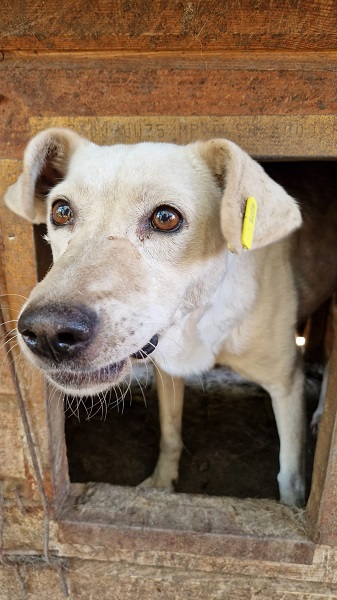Die freundliche Hündin entdeckten wir in einer Hütte, aus der sie neugierig schaute. Sie nimmt gut Futter aus der Hand und man kann sie vorsichtig am Kopf anfassen. Insgesamt ist sie aber etwas unsicher und weicht aus, wenn man sie streicheln möchte. Sie hat nur 3 Beine und kann damit auch nicht gut laufen, zumindest, was wir so beobachten konnten, als sie kurz raus kam, um ihre Geschäfte zu erledigen. Sie ist etwas zutraulich und taut mit Verständnis sicher noch auf. Wir konnten keine Interaktionen mit anderen Hunden beobachten, sie sitzt aber mit vielen Hunden zusammen, daher schätzen wir sie verträglich ein.