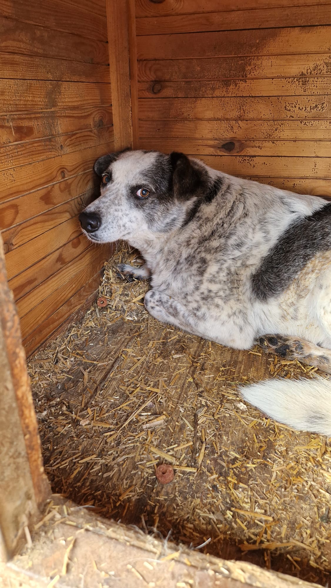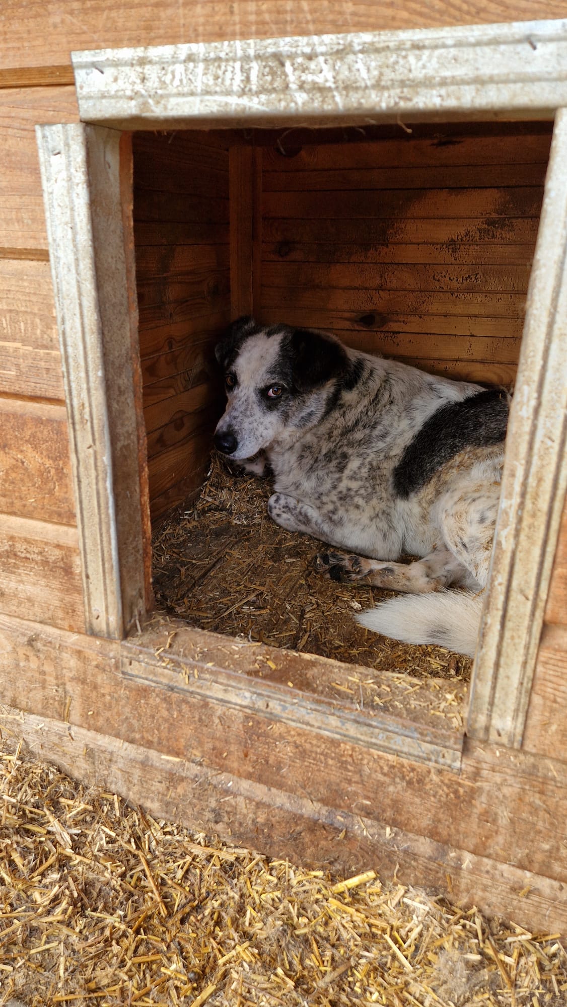 SYDNEY hat sich bei unserem Besuch ängstlich in seine Hütte zurückgezogen. Bei Annäherungsversuchen weicht er zurück, er kennt Kontakt zu Menschen einfach nicht so. An unseren Leckerlies hat er zwar interessiert geschnuppert, wenn wir sie ihm hingelegt haben, fressen wollte er sie aber nicht.