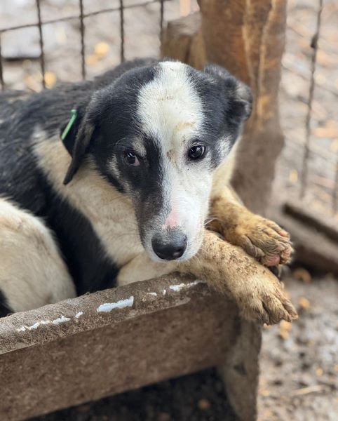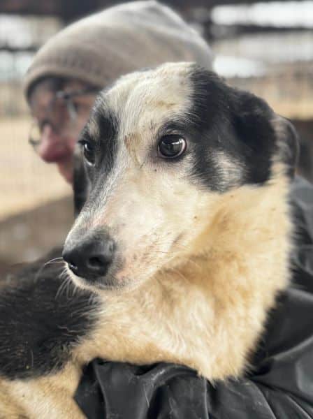 TALBOT zeigte sich uns gegenüber beim Betreten des Kennels etwas neugierig. Als wir ihm unsere Aufmerksamkeit schenkten, zog er sich zunächst in die Hütte zurück. Dort konnten wir ihn leicht an der Schnauze berühren. Später konnten wir ihn außerhalb der Hütte unter Bedrängung anfassen. Er zeigte zunächst ein kurzes Abschnappen, beruhigte sich aber schnell, sodass wir ihn auch hochheben konnten. Er wird Eingewöhnungszeit brauchen, da er den menschlichen Kontakt nicht gewohnt ist. In seinem gemischten Rudel zeigt er sich verträglich.