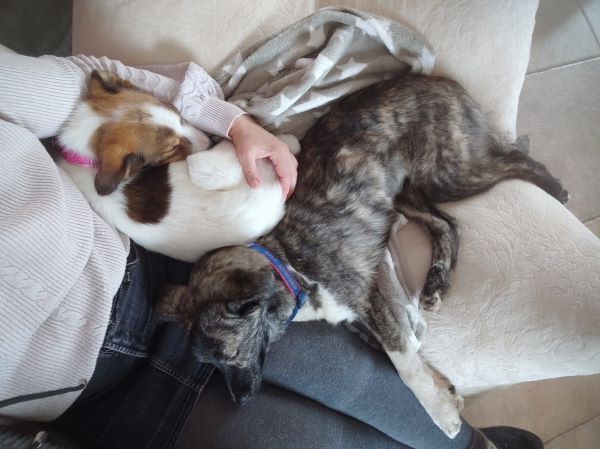 Zuhause fühlt sie sich pudelwohl; die Menschen, die anderen Hunde, die Katzen gehören dazu und sie ist freundlich und freudig zu allen. Sie ist eine sanfte Seele, eine Hündin, die gerne alles richtig machen möchte. Ansagen von den älteren Hunden nimmt sie sofort an, trollt oder unterwirft sich und fragt anschließend freundlich an, ob jetzt alles wieder gut ist. Die neu hinzugekommenen Junghunde sind jetzt ihre liebsten Spielgefährten. Mit ihnen tollt sie durch den Garten, lümmelt sich auf der Terrasse und lässt sich die Sonne auf den Pelz scheinen.