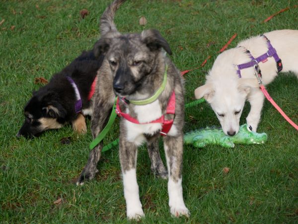 Von der Viererreisegruppe aus Februar übriggeblieben, hat Tammi die letzten drei Wochen gut für sich genutzt. Vom freundlichen aber flüchtigen Hundekind zum fröhlichen aufmerksamen Mädchen, erkundet sie immer sicherer die Welt auch außerhalb des Grundstücks. Dabei ist sie immer vorsichtig und braucht Zeit und liebevolle Begleitung beim Verarbeiten. Auf Spaziergängen im Rudel ist sie gerne und neugierig dabei; neue Eindrücke lässt sie ab und zu noch erst mal auf sich einwirken bevor es dann weitergeht. Sie orientiert sich am Pflegefrauchen und an den anderen Hunden; Begegnungen mit fremden Hunden und Menschen werden ebenfalls zunächst auf Abstand erlebt und dann je nach Gegenüber erleichternd aufgelöst. Der Wald mit seinen vielen guten Gerüchen, dem weichen Boden und knackenden Geräuschen ist ganz ihrs. Brav geht sie an der Leine, hält ihren Radius gut ein, ist folgsam dabei.