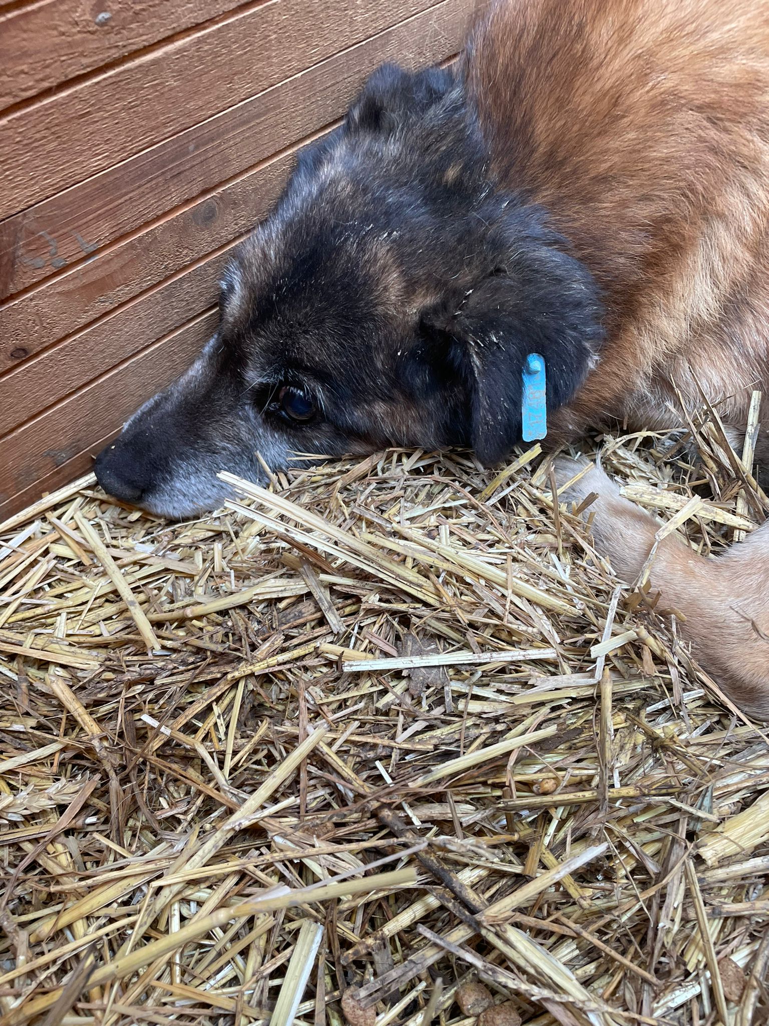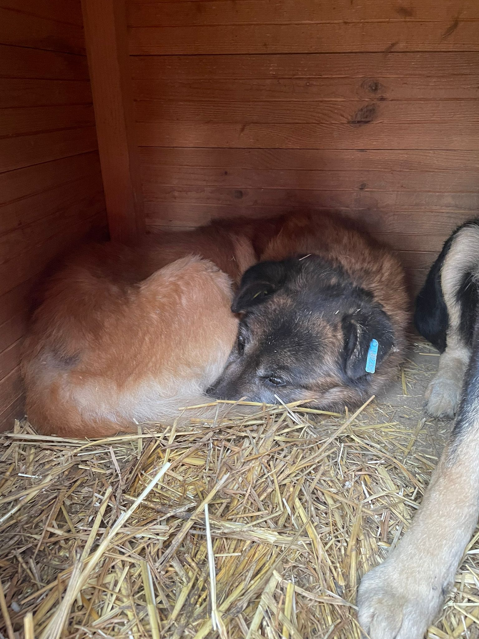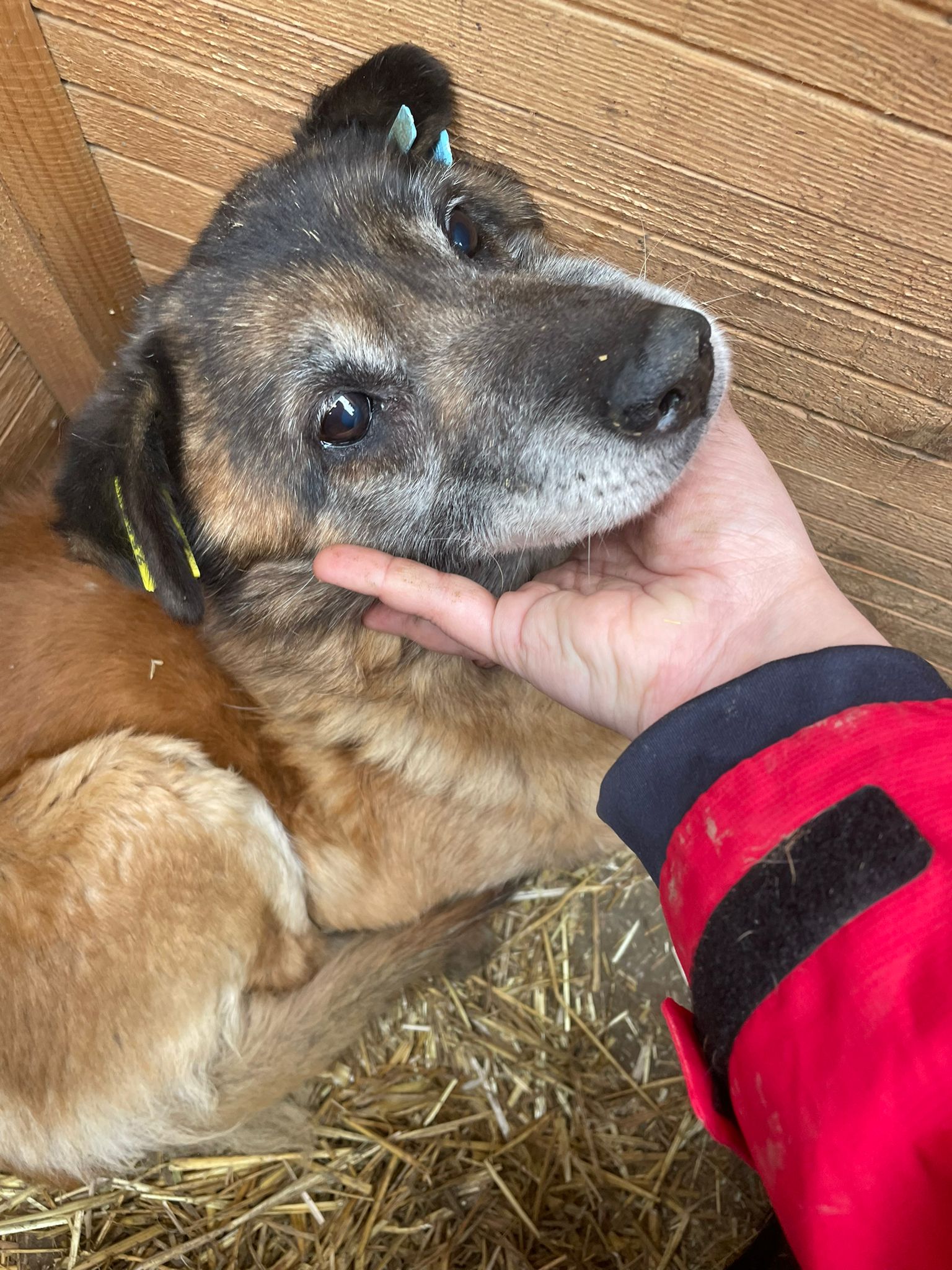 Opa TANO haben wir viel zu dünn und völlig resigniert zusammengerollt in einer Hütte liegend vorgefunden. Er scheint allen Lebensmut und alle Hoffnung verloren zu haben. Wir konnten ihn überall streicheln, genossen hat er es in dieser Situation aber nicht. Seinen Kennel teilt er sich mit weiteren älteren Hunden, das schein gut zu klappen.