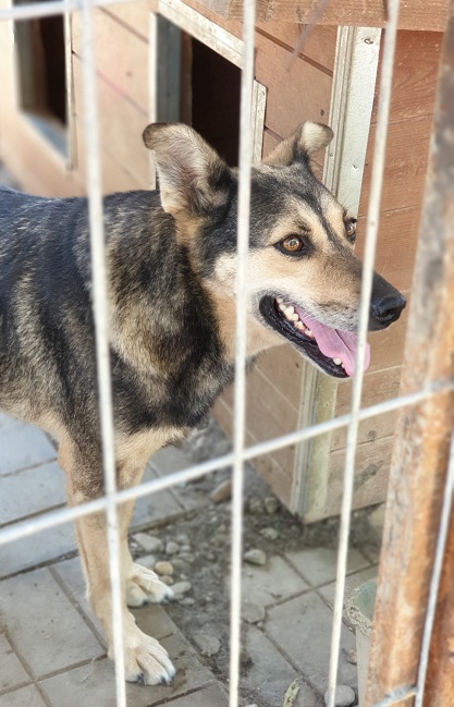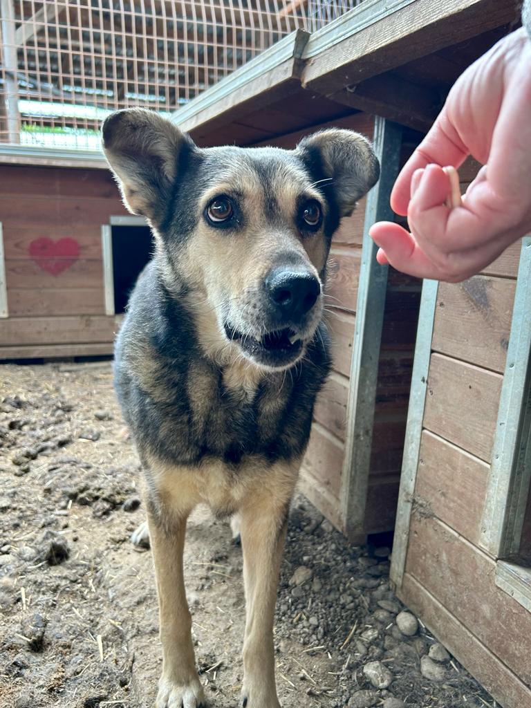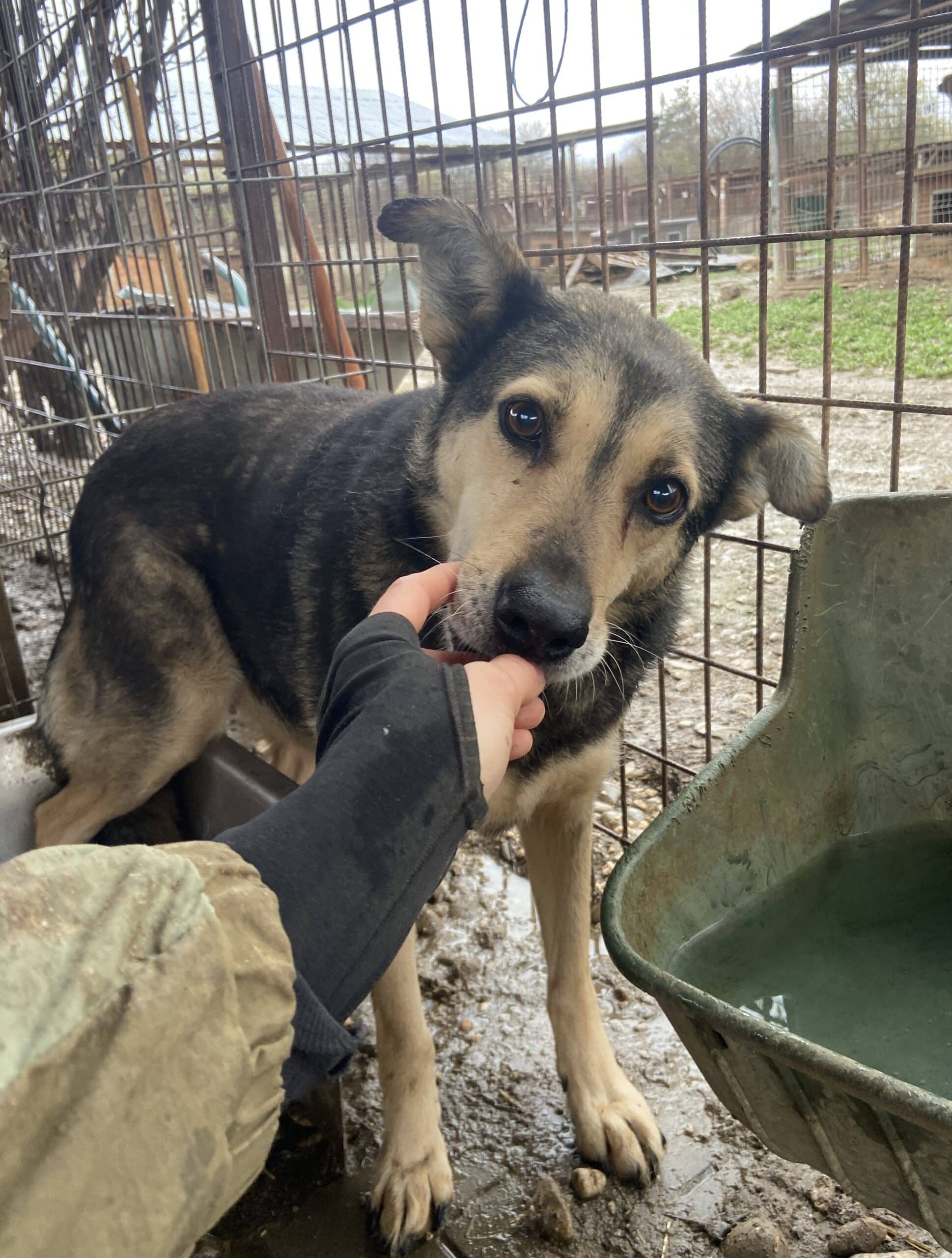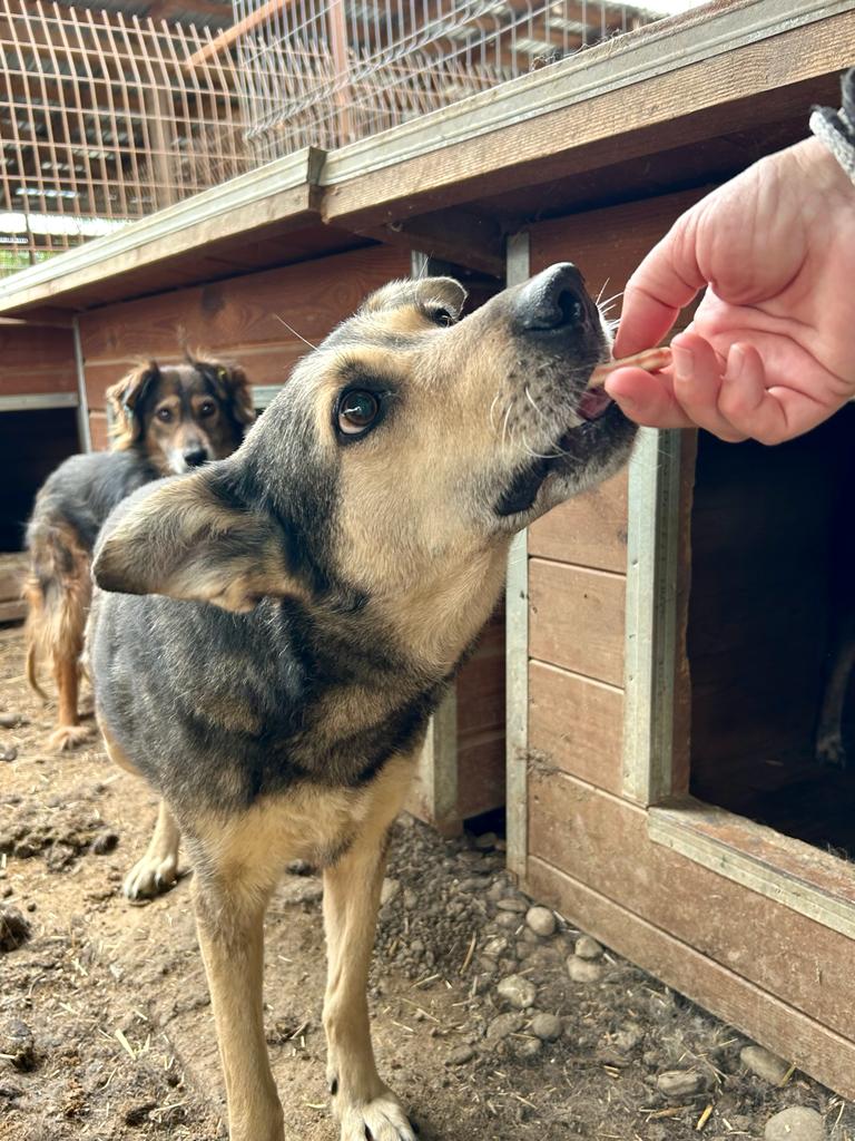 Tara ist weiterhin eine offene und freundliche Hündin, die unsere Leckerlies aus der Hand nahm. Dabei konnten wir sie leicht an der Nase berühren. In ihrem Kennel ist derzeit ein Hund, der uns Menschen auf Abstand hielt, sodass wir Tara nicht weiter bedrängen wollten.