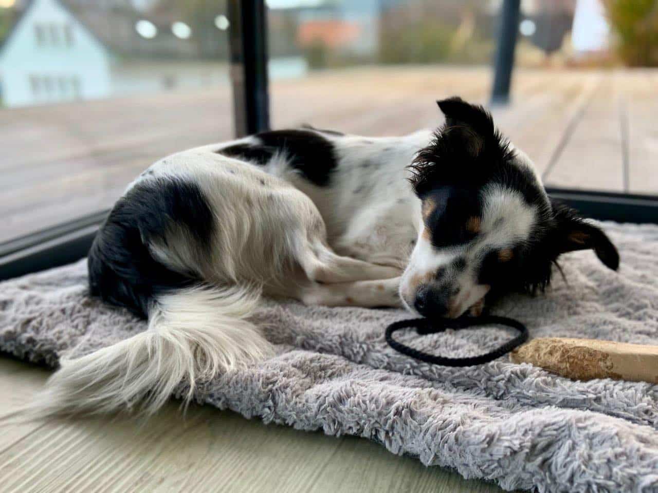 Tarka ist von Anfang an stubenrein, schläft nachts durch, läuft Treppen, lässt sich gerne bürsten, kennt die Hausregeln und kommt dort auch gut zur Ruhe.