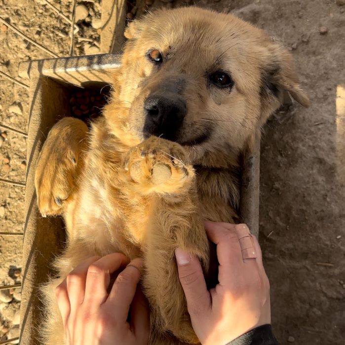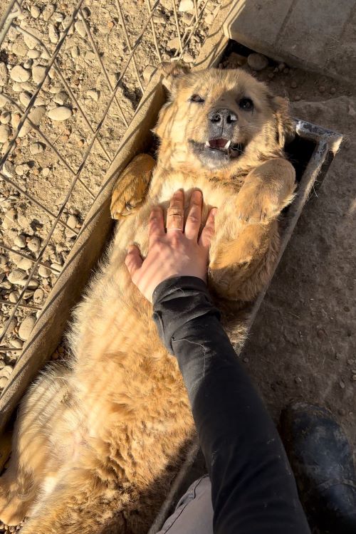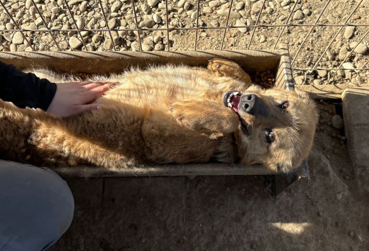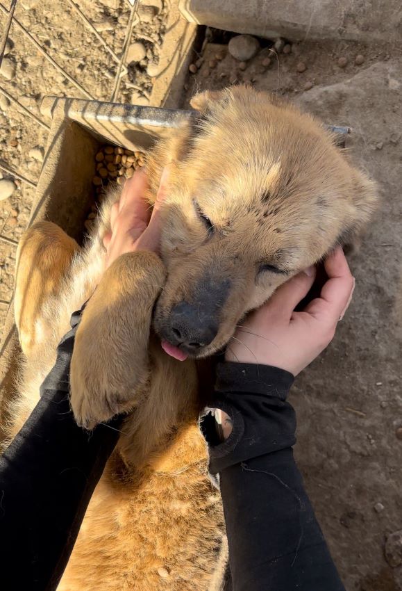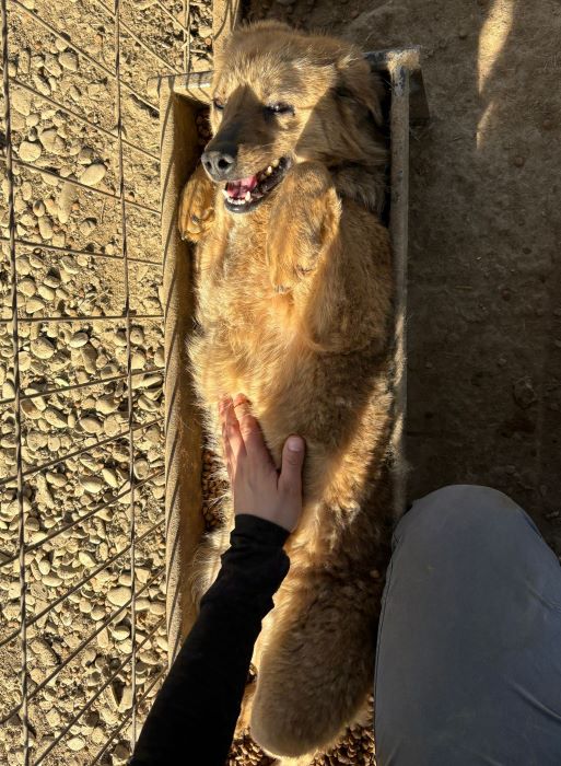 Es brauchte nur wenige Momente und einige Leckerlie – dann war das Eis gebrochen, TARY kam hervor und ließ sich liebend gern streicheln. Man merkte ihm an, wie mit jeder weiteren, liebevollen Berührung seine Freude über die vermutlich noch unbekannte Zuwendung wuchs. Schließlich legte er sich sogar in den Futtertrog, um sich ausgiebig das Bäuchlein kraulen zu lassen. TARY wirkte für diesen kurzen, kostbaren Moment so glücklich und sorglos. Einfach froh darüber, dass endlich jemand da war, der lieb zu ihm ist.