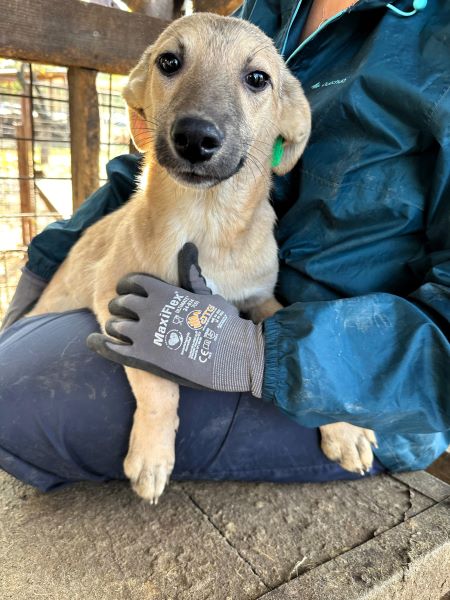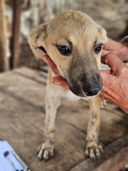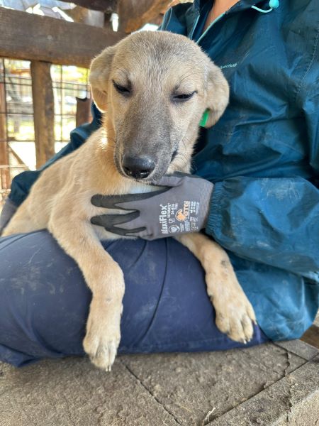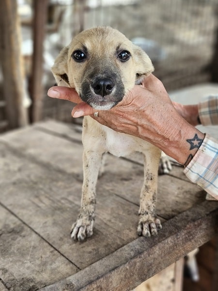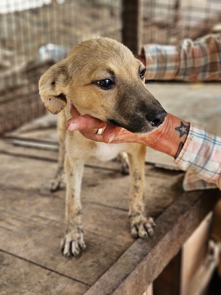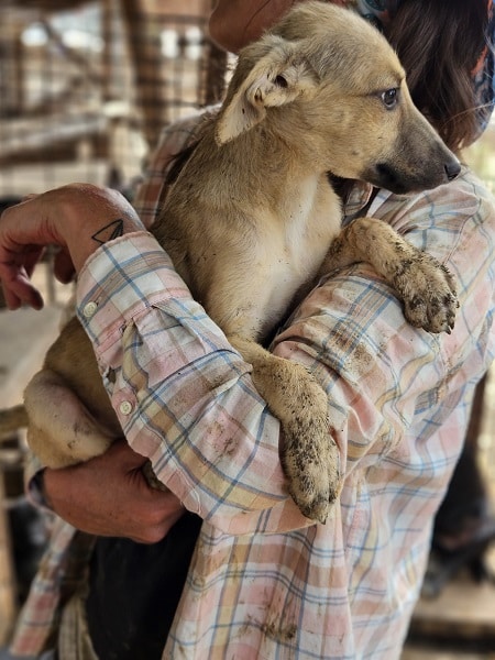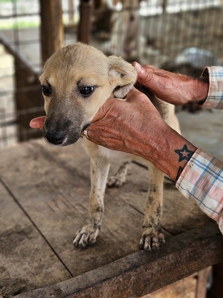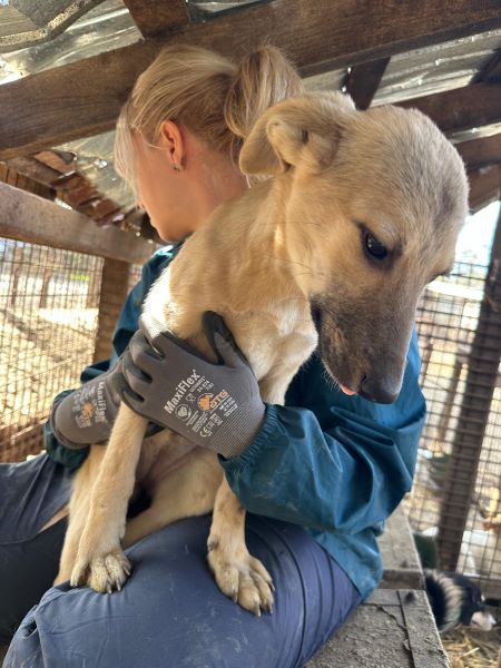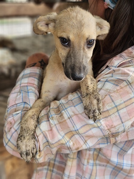 Die zarte Tereza war zunächst hinter der Hütte verschwunden und beobachtete uns neugierig. Wir konnten sie auf den Arm nehmen, dabei erstarrte sie. Nach kürzester Zeit konnte sie die Streicheleinheiten genießen und ließ sich fallen. Der fehlende Menschenkontakt sollte dringend nachgeholt werden, bevor es für die schüchterne Hündin zu spät ist. In einem geduldigen Zuhause wird sie schnell auftauen.