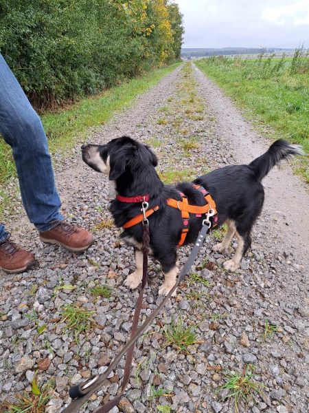 Tess geht ganz toll an der Leine, hat keine Angst vor Autos, Fahrrädern oder Rollatoren. LKWs sind allerdings unheimlich. Sie kann Sitz machen und lässt sich super bestechen, denn jede Art von Futter ist ein Highlight für sie.