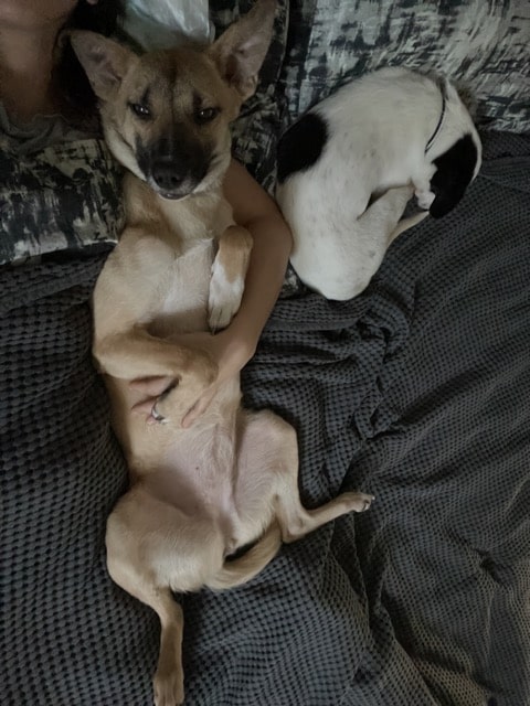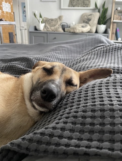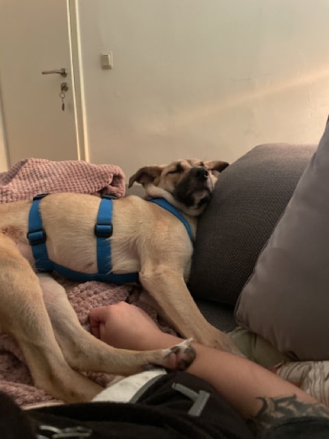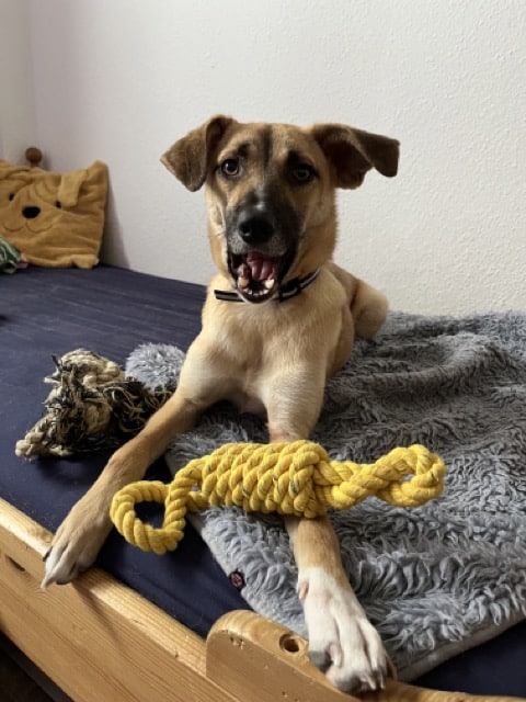 THEKLA kennt es, im Bett und auf dem Sofa zu schlafen, wählt aber auch gerne freiwillig das Hundebett.