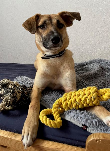 THEKA hätte am liebsten einen Hundekumpel, der auch draußen mit ihr spielen möchte. Sie begegnet fremden Hunden zunächst vorsichtig und hält Abstand, bis sie die Situation etwas einschätzen kann. Dann ist sie neugierig, freundlich und verspielt.