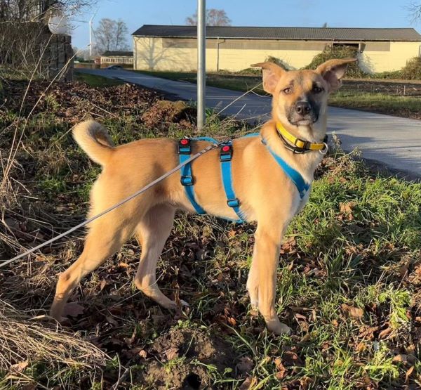 Insgesamt wirkt sie draußen souverän und selbstbewusst, lediglich dicht vorbeifahrende Fahrzeuge sind verständlicherweise etwas gruselig. Sie orientiert sich an der Schleppleine gut um und wird darin auch durch Lob und Leckerlie bestärkt. Man merkt ihr richtig an, wie stolz sie dann ist.