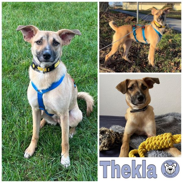 Fremde Menschen werden zunächst ebenso wie fremde Hunde beobachtet, sie traut sich jedoch schnell dicht heran, ist neugierig und freundlich und freut sich über Aufmerksamkeit. Bekannten Personen begegnet THEKLA sehr freudig und sucht aktiv den Körperkontakt. Sie zeigt sich mit vertrauten Menschen verschmust und genießt Streichel- und Kuscheleinheiten sehr. Kleine Kinder hat THEKLA bisher nicht kennengelernt, Teenager sieht sie wie Erwachsene.