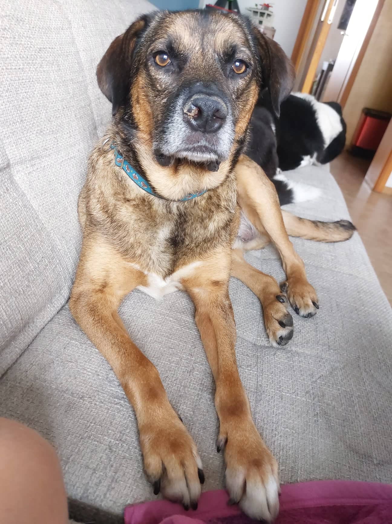 Leider hatte Thunder vor einigen Jahren in Rumänien wohl einen Unfall und hat seitdem Schmerzen in einem Zeh an seiner linken Pfote, weswegen er das Bein meistens nicht nutzt. Durch diese Überbelastung hat er in seinem rechten Bein Arthrose entwickelt. Aktuell wird noch abgeklärt, ob die Schmerzen im Zeh durch physiotherapeutische Maßnahmen behoben werden können oder ob der Zeh vielleicht amputiert werden muss.