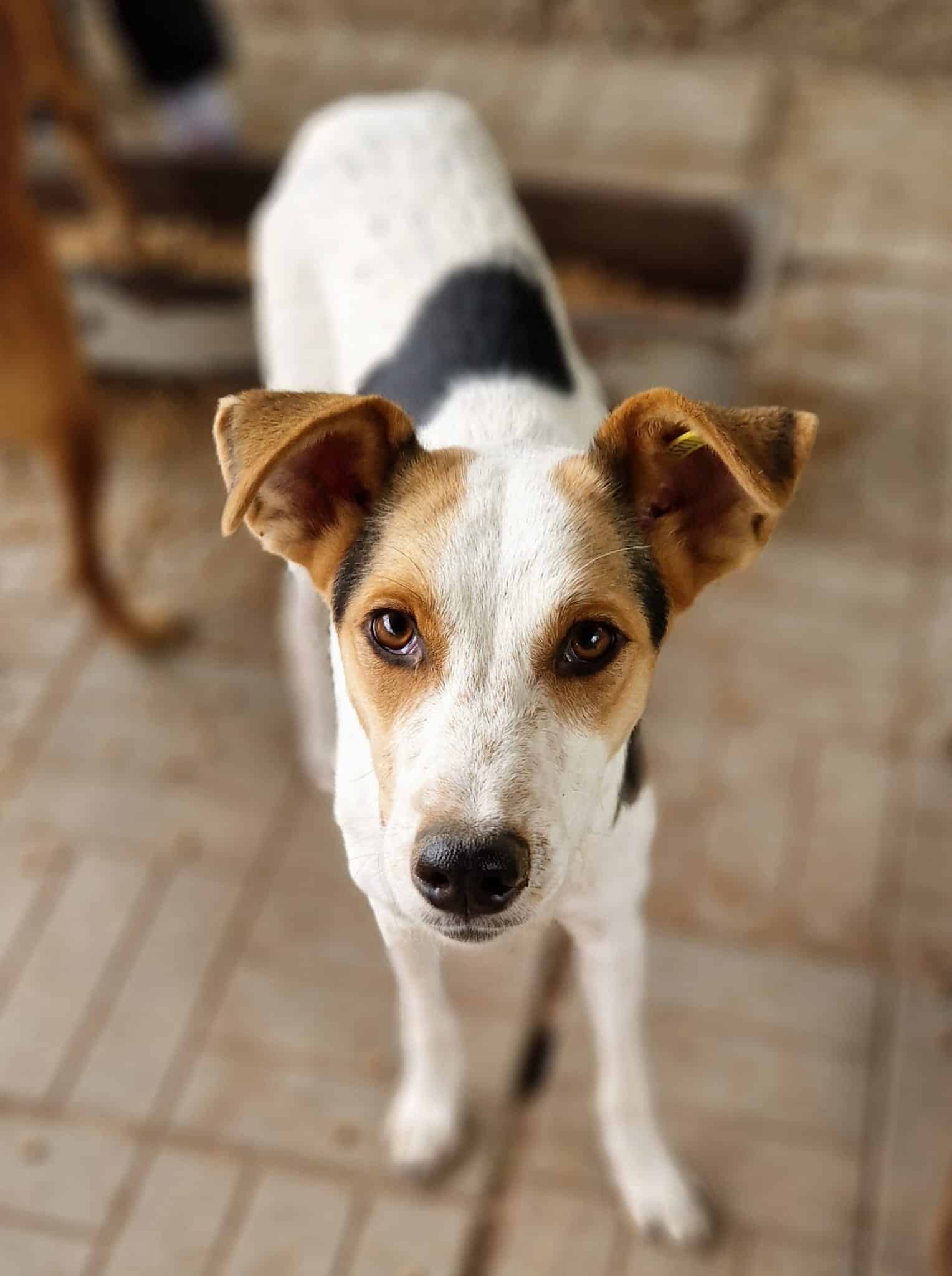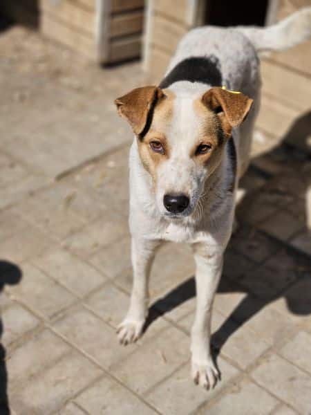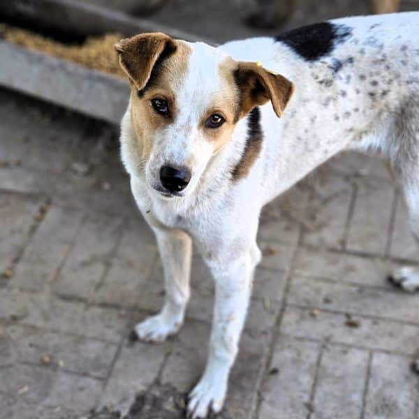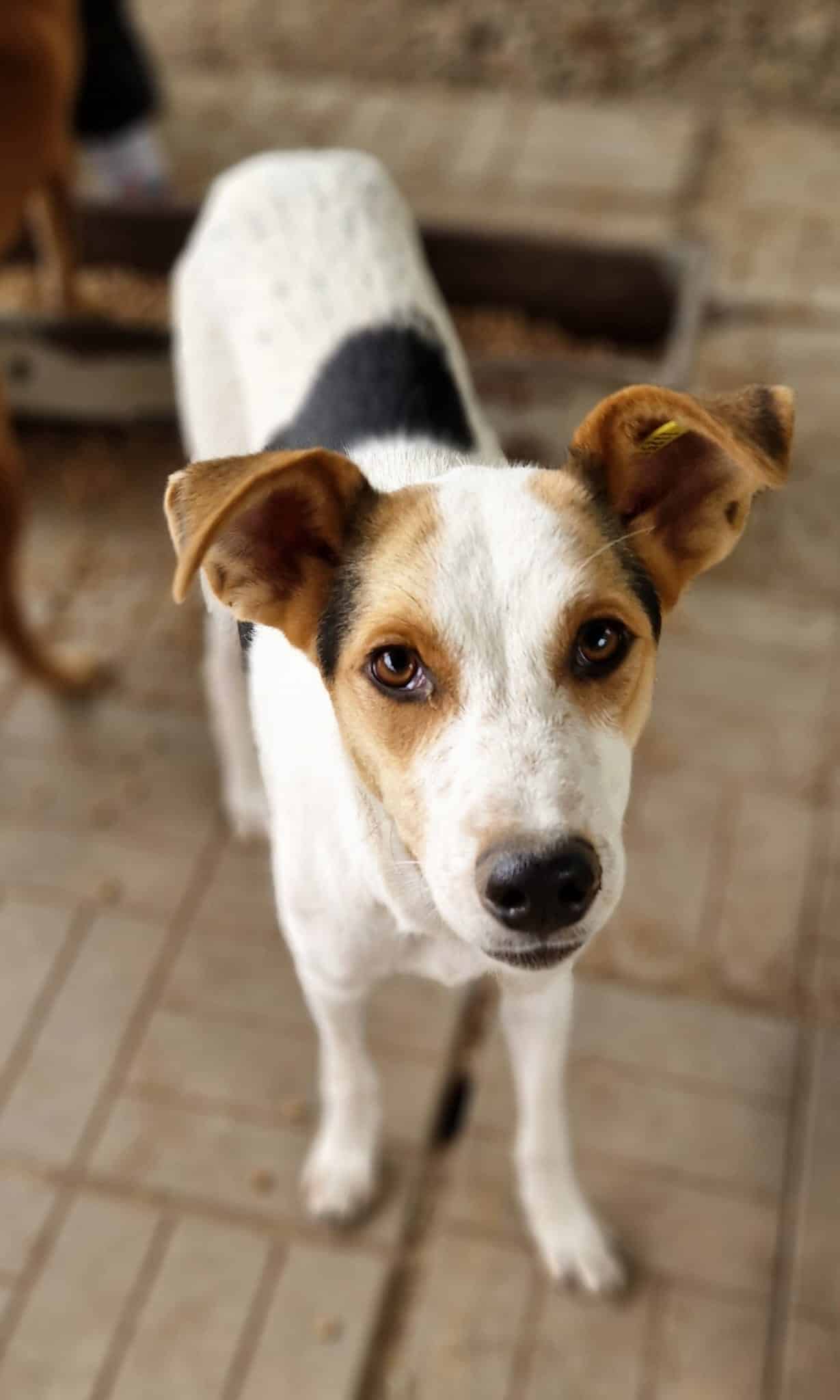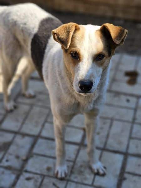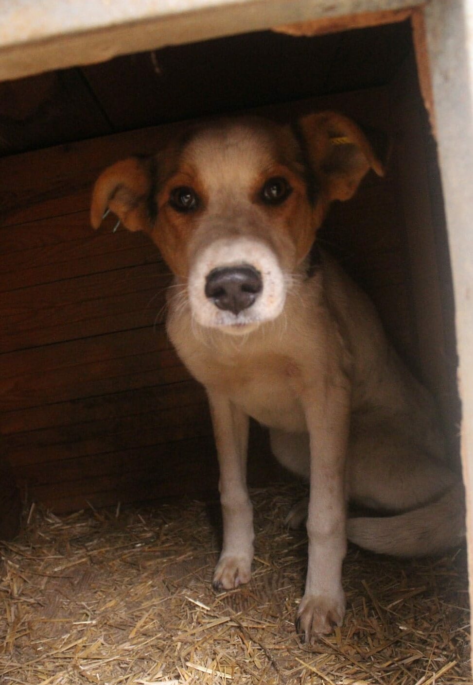 TIBBO ist ein junger Rüde, der leider viel zu dünn ist. Er wird in seinem Kennel gemobbt und nicht ans Futter gelassen. Zunächst saß er nur in der Hütte und nahm unsere Leckerlies gerne an. Obwohl er unsicher ist, konnten wir ihn dort nach kurzer Zeit auch am Kopf streicheln, auch wenn er sich dabei noch sehr unwohl gefühlt hat.